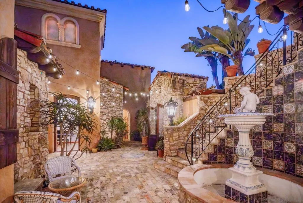 A true showpiece in Rancho Santa Fe’s exclusive Cielo community, this architectural estate sits privately perched above it all, capturing uninterrupted panoramic views that stretch from rolling hills to the Pacific Ocean. Designed by acclaimed architect Dena Gillespie, known for crafting homes with mystique and presence, this 4+ bedroom villa is a masterclass in timeless design, blending reclaimed European elements with refined craftsmanship and modern sophistication. The front courtyard, anchored by a custom Vietri fountain and grand stone staircase, sets a cinematic tone that continues throughout the home’s dramatic interiors and seamless indoor-outdoor flow. The backyard has a patio with fire pit, private guest quarters, solar power, and a spa elevate the lifestyle offering, while the unique lot shape creates over 220 feet of backyard frontage with space for a resort-style infinity pool and a one-acre hillside ready for a vineyard. Every detail of this estate has been curated to deliver character, elegance, and star-level appeal in one of Rancho Santa Fe’s most prestigious settings. Cielo offers an exceptional lifestyle centered around the Cielo Club, an 8,000 sq. ft. facility featuring elegant event lounges, a catering kitchen, meeting rooms, a modern fitness center, and spa amenities. Outdoors, residents can enjoy a competition-sized pool, a children’s wading pool, a shaded pavilion with gas grills, tennis courts, and a playground. The Montagna Club adds even more with its own pool area, open-air pavilion, outdoor fireplace, and tennis courts. Spanning 1.5 acres, Cielo Park is a recreational haven with basketball and sand volleyball courts, a climbing wall, sports fields, and picnic areas with BBQs—perfect for active days and relaxed gatherings alike.