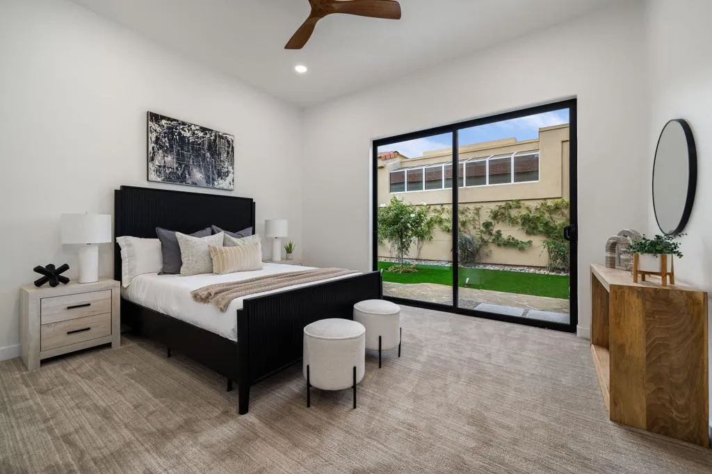 PRICE IMPROVED! SOUTH FACING views from this stunning, beautiful REMODELED residence designed to captivate from the moment you arrive. Enter through the welcoming courtyard and step inside the impressive glass pivot door, where expansive views, contemporary design, a soothing color palette and thoughtful high-end updates unfold throughout the home. The bright, light home is enhanced by the walls of windows and the amazing VIEWS! This private pool retreat offers 2,871 sq. ft. of sophisticated living space, featuring three en-suite bedrooms, an elegant powder room, and an exceptionally spacious primary suite. The open-concept design flows seamlessly from the inviting family room to the refined living area, highlighted by a striking see-through fireplace, and leads into the dining space. The stylish bar serves as a natural gathering hub. The showpiece kitchen complete with a generous island and top-tier finishes is perfectly designed for unforgettable entertaining, all framed by captivating lake and mountain views.Outside, the SOUTH FACING pool enjoys abundant sunlight with generous awnings providing comfortable shade. A tranquil side patio offers an intimate outdoor escape--perfect for relaxation or accommodating a pet. Discover a home where luxury, comfort, and design come together seamlessly. The newest Desert Home Investors project is waiting for you!