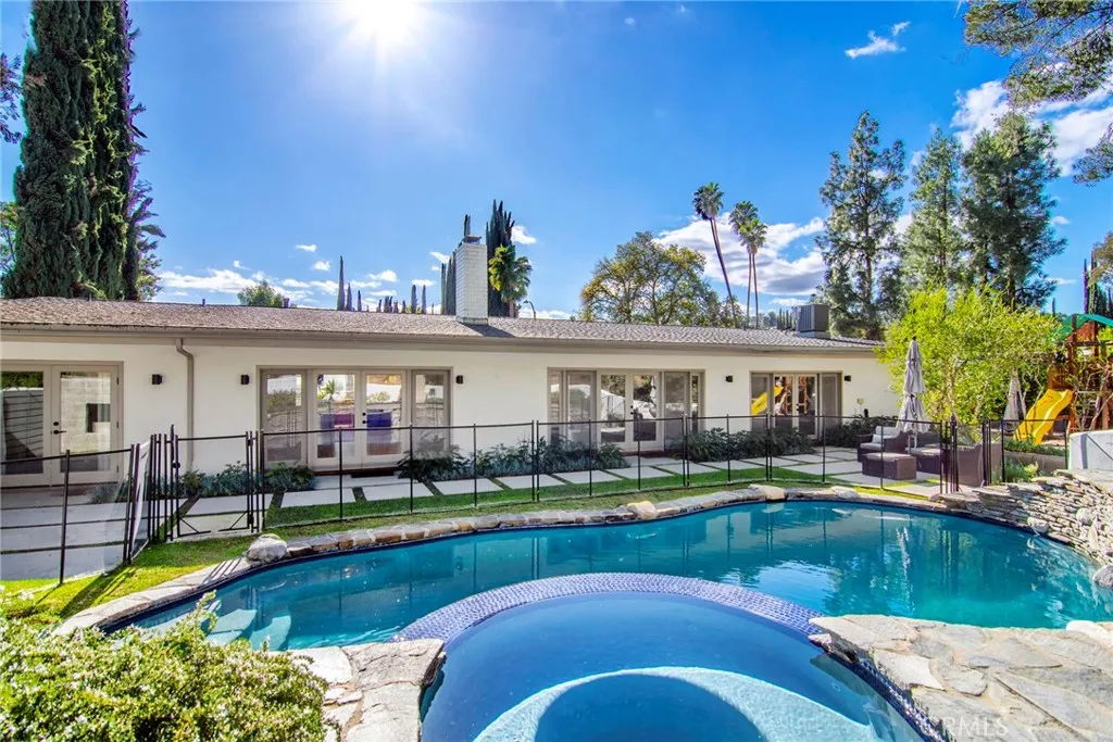 Almost everyone loves a Charles Du Bois designed home and with amazing upgrades there’s reason to love it even more! Presenting an incredible solar-powered single-level pool home within this ultra-desirable “South of Blvd” Tarzana locale. This one will make you smile a mile wide from the very first moment you arrive. Beautiful landscape, stack-stone accents and an incredible wooden entry-door make a prime first impression. Inside, an open Living Room and Family Room are enriched with gorgeous wood beam vaulted ceilings and a distinct double-sided fireplace. Custom French doors in each, provide easy access to the rear. This kitchen is truly what dreams are made of. Loads of stunning custom cabinetry, huge center-island with wine refrigerator, dazzling counters and large windows to invite natural light to shine. At the east-wing, discover an ensuite with bathroom that provides outdoor access…ideal for use from the pool. Additional Jack and Jill bedrooms share a tastefully remodeled bath. Spacious primary suite features French Doors, walk-in closet and unique custom designed bathroom with separate tub and shower. Outside, a large refreshing pool, elevated spa and fireplace awaits. Upper-level relaxation arena provides a tranquil escape from it all. Solar is 100% owned so no extra payment required. All this and sought-after schools too……don’t miss! Several photos have been virtually staged,