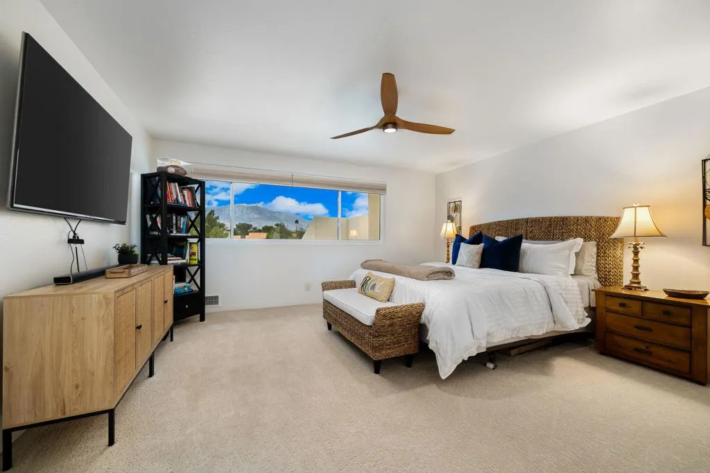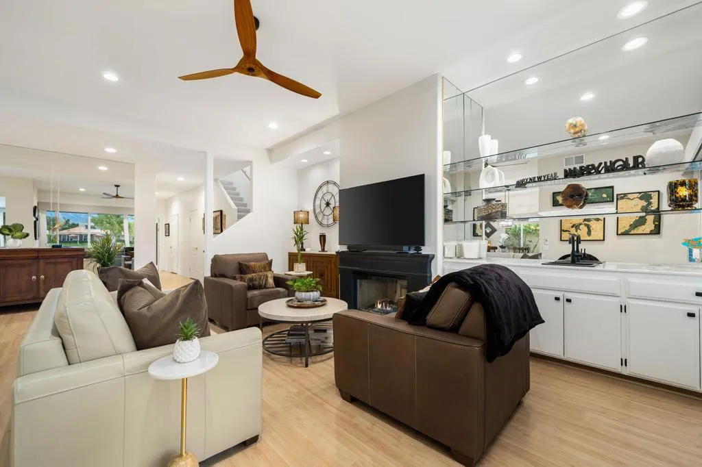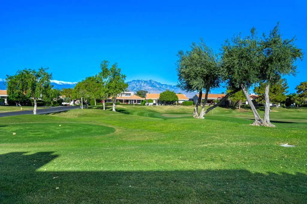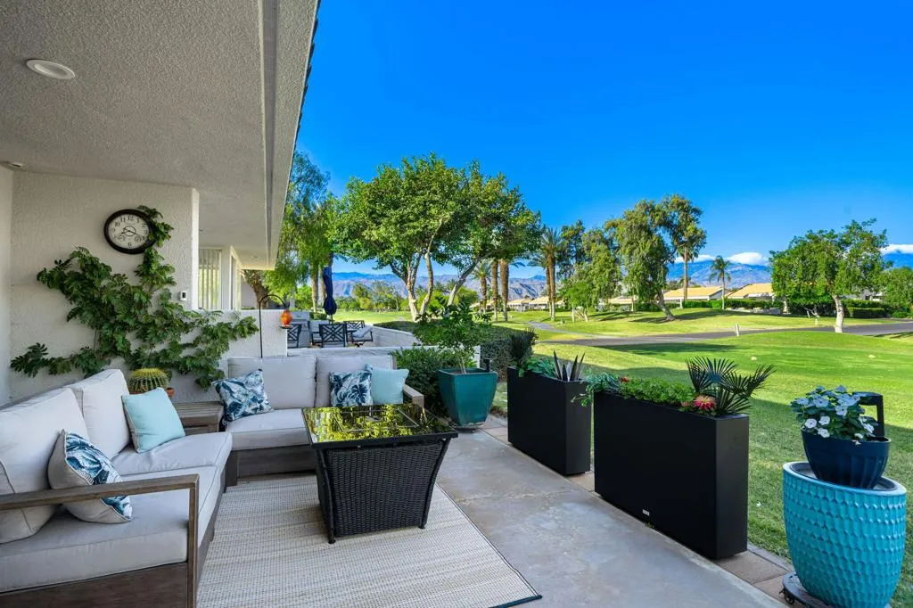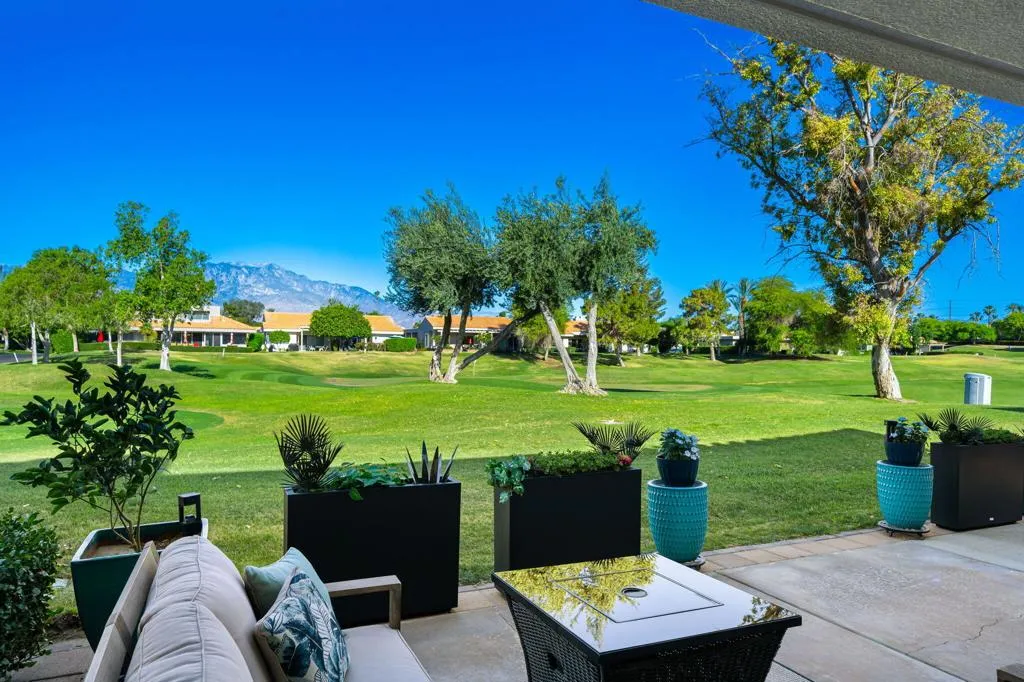 Wake up to lush fairway views and enjoy breathtaking west-facing mountain sunsets from this beautifully updated residence in Mission Hills East, located within the prestigious Mission Hills Country Club. The expanded rear patio serves as a true extension of the living space, offering an inviting outdoor setting ideal for entertaining, sunset gatherings, or relaxing while overlooking the rolling greens and surrounding mountains.A private gated courtyard with mature cacti creates a welcoming desert retreat and leads into a warm, thoughtfully designed interior. The home features wood laminate flooring, a cozy fireplace, and a stylish wet bar, ideal for both everyday living and entertaining. The flexible floor plan offers a spacious living and dining area, two private primary suites, and a third bedroom well-suited for guests or a home office. The kitchen blends function and style with slab granite countertops and newer appliances, including an induction air-fryer/convection oven. Recent upgrades include new windows and sliding doors, recessed lighting, a newer heat pump air conditioning system, duct-work replacement, updated switches and receptacles, and enhanced indoor-outdoor flow that complements the home's resort-style setting.