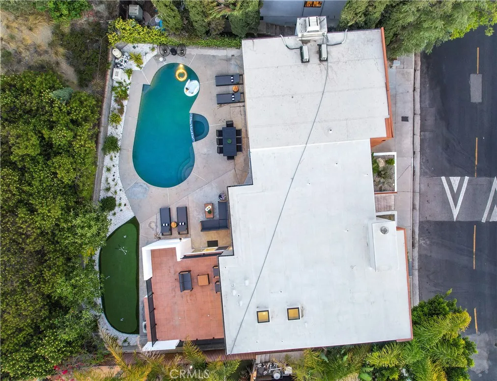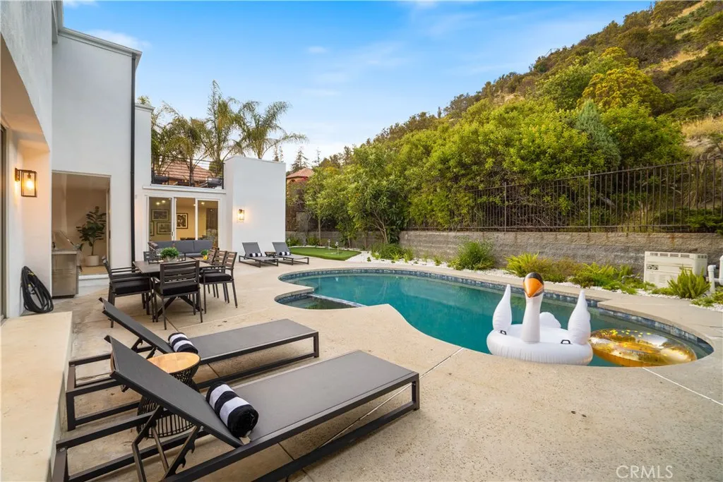 Nestled in the prestigious Mount Olympus neighborhood of the Hollywood Hills, this stunning fully furnished 5-bedroom, 4-bathroom residence offers the perfect blend of luxury, comfort, and style. The expansive living room showcases soaring ceilings, recessed lighting, and rich wood floors, creating an elegant yet inviting atmosphere. The chef’s kitchen is thoughtfully designed with a large center island, granite countertops, stainless steel appliances, a double oven, and abundant cabinetry, seamlessly flowing into the sophisticated dining area—ideal for both everyday living and entertaining. A spacious family room/game room with a wet bar provides the perfect setting for gatherings and relaxation. The main level includes a generously sized bedroom and full bathroom, offering flexibility for guests or a home office. Upstairs, the luxurious primary suite features breathtaking hillside views, a walk-in closet, and a spa-inspired en-suite bathroom complete with a soaking tub, separate shower, double vanities, and a private terrace. Three additional bedrooms and two full bathrooms complete the upper level. Designed for seamless indoor-outdoor living, floor-to-ceiling doors open to a private backyard oasis featuring a pool, spa, and putting green—perfect for entertaining or unwinding in complete privacy. Move-in ready and impeccably appointed, this exceptional home is located in one of Los Angeles’ most desirable enclaves.