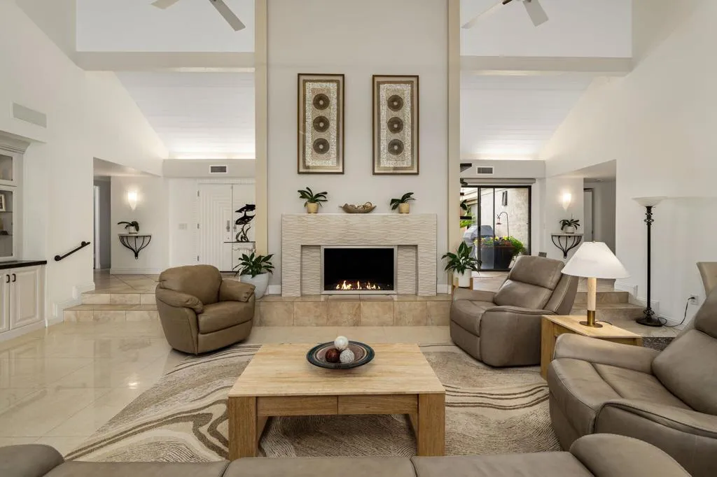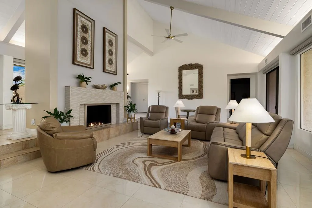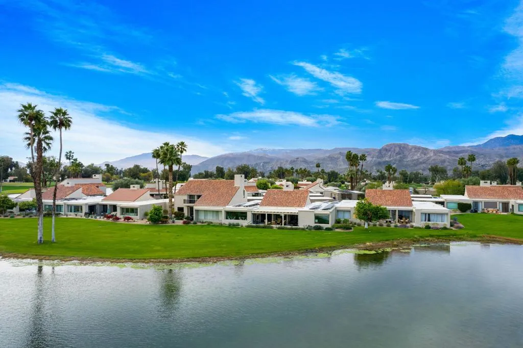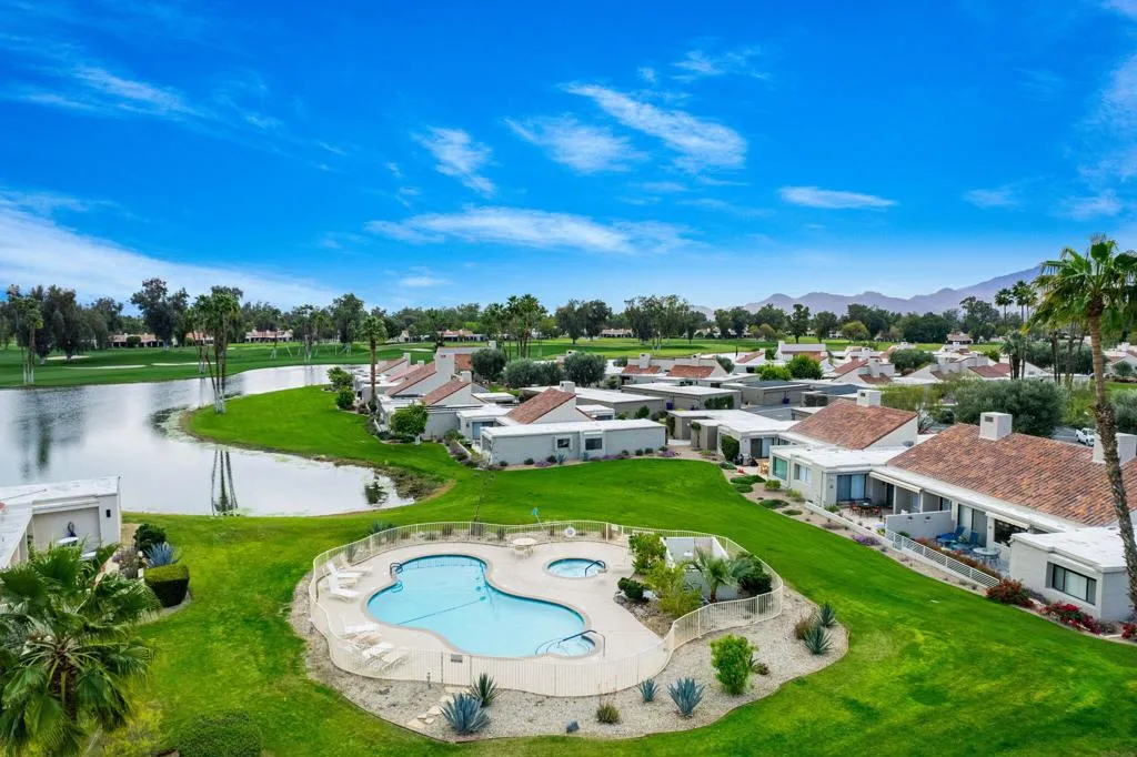 Experience true resort living in this spectacular lakefront residence overlooking the 18th hole of the famed Dinah Shore Tournament Course, the Mission Hills Country Club clubhouse, and the majestic mountains beyond. The private, covered outdoor living room is a showpiece--perfect for entertaining, relaxing, or enjoying peaceful mornings and unforgettable sunsets reflected across the water.A spacious, south-facing courtyard recently renovated offers an inviting setting for gatherings and seamless indoor-outdoor living. Inside, the light-filled living room features vaulted ceilings, stunning updated flooring, a custom built-in entertainment center, fireplace, motorized shades, and tranquil lake views.Designed for connection and comfort, the social kitchen includes a granite island with counter seating, stainless steel appliances, and opens effortlessly to the dining room/den/game room, all framed by forever lake views and motorized shades. The primary suite is a serene retreat with breathtaking lake views boasting a recently updated bath with double vanities, and a walk-in closet.Two spacious guest bedrooms, each with an updated en-suite bath, provide ideal accommodations for family, friends, or a home office. Additional highlights include owned solar and close proximity to the community pool and spa completing the ultimate Mission Hills resort lifestyle.Your private lakefront desert paradise awaits.