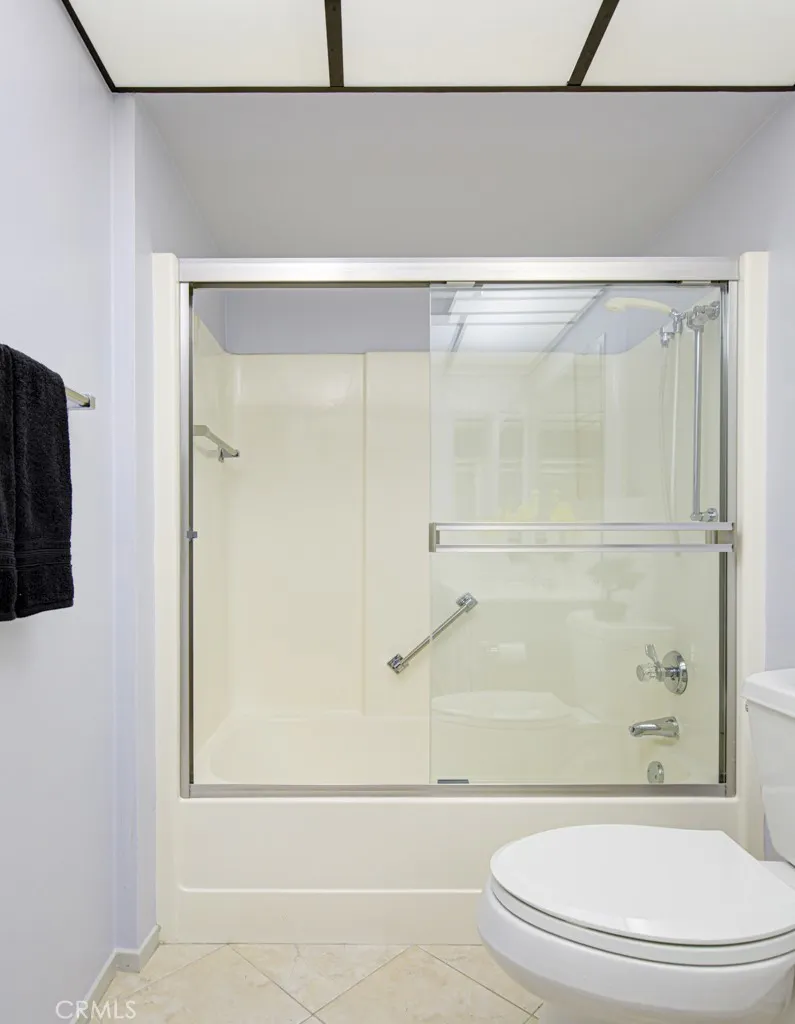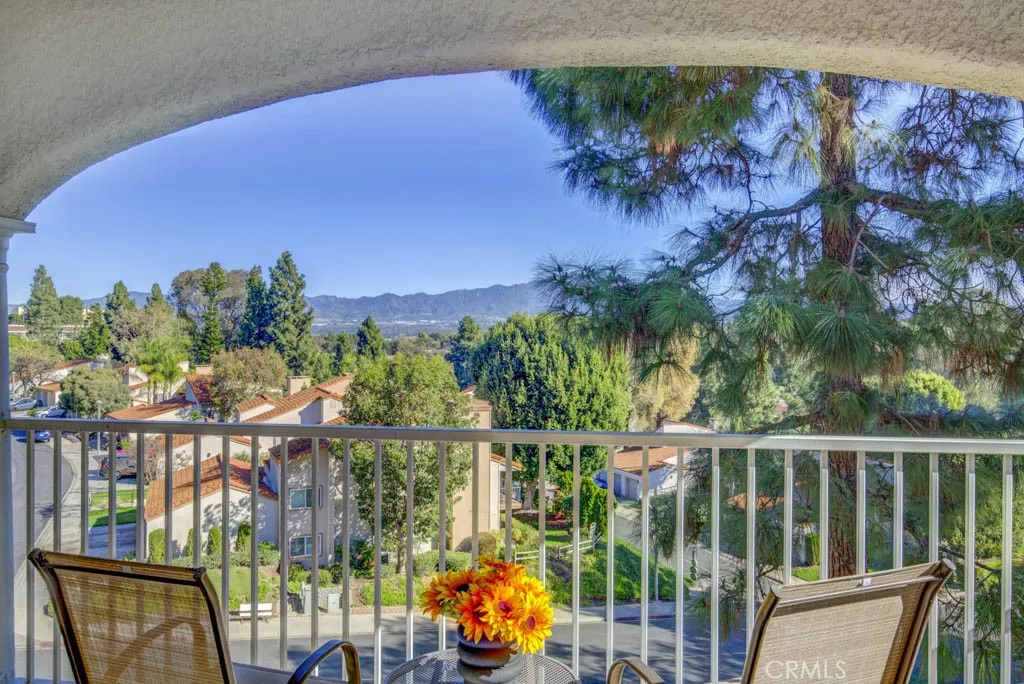 EXPERIENCE THIS HOME BY CLICKING ON THE 360's - An elevator takes you practically to the front door of this beautifully upgraded, top floor VILLA NUEVA model, and OH, WHAT A VIEW! This home is perched atop a hill, surrounded by trees and greenery. Enjoy vistas of the neighborhood, valley lights and Saddleback Mountain, and nearby access to the 73 Toll Road. The heart of the home — an extraordinary, transformed kitchen — features custom cabinetry topped with luxurious slab granite and high-quality LG appliances. A rare skylight fills the space with natural light. Elegant ceramic tile floors mimic wood while offering water resistance. An ingenious bar under the arched opening connects the kitchen to the living room — perfect for a casual bite or storing large serving pieces. The kitchen opens to the dining area and living room, making entertaining easy. The dining room’s mirrored wall reflects the sweeping view through large glass doors, drawing your eye outdoors to the serene neighborhood and trees below. The generous living room features lush slate-gray carpet with extra-thick padding and a large dual-paned window that frames the view and welcomes coastal breezes. A central hallway leads from the front door through the main living areas, and in the opposite direction to bedrooms and bathrooms. The guest bedroom offers a peaceful view of the trees through dual-pane windows with plantation shutters, plush carpet, a large closet, and space for a queen-sized bed. The adjacent guest bathroom features a vanity, tub with newer shower door and fixtures. Welcome to the Primary Suite — your retreat. Large windows showcase serene views and plantation shutters allow you to control the light. The spacious bedroom easily fits a king-sized bed and large furniture. The Primary Bathroom features a double-sink vanity and step-in shower with updated glass doors. Behind the building, you’ll find lush, HOA-maintained park-like landscaping. Ownership includes access to Laguna Woods Village’s resort-style amenities:100+ basic cable channels, water, sewer, trash included, Two golf courses: 27-hole championship and 9-hole par-3, Seven clubhouses, five pools, three fitness centers, 250+ clubs and social groups, Fare-free bus to shopping, dining, medical. ll of this — just 6 miles from world-renowned Laguna Beach with easy access to the 73 Toll Road, 5, and 405 freeways. Enjoy the exceptional lifestyle that is Laguna Woods Village!
