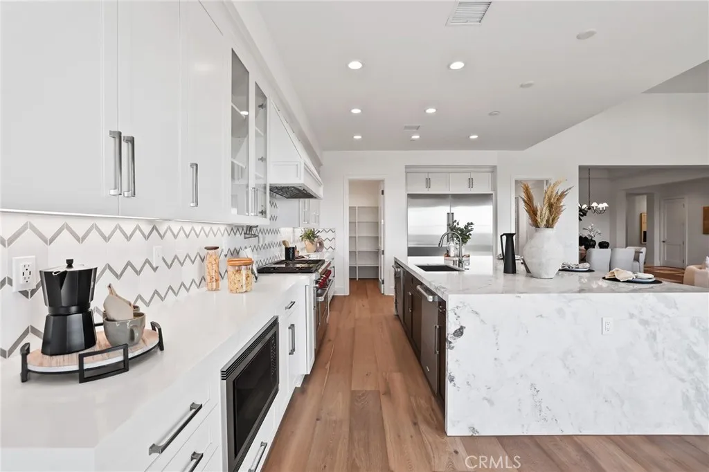 SINGLE STORY LIVING - SUNSET & CITY LIGHT VIEWS- END OF CUL-DE-SAC LOCATION, 17,000 sf+ POOL SIZED LOT and NEW CONSTRUCTION within GATED Saddle Crest community. Finished with thousands in designer selected finishes, this price includes folding glass doors, fireplace in great room, upgraded cabinets, WATERFALL ISLAND with Calcutta Umber quartz plus designer selected countertops and surrounds in each bath. Hardwood floors in the great room, kitchen, office and primary bedroom, gorgeous custom Calcutta Umber and wood entry floors, and upgraded tile flooring in bathrooms and oversize laundry room. Semi-custom construction with the highest standard of living for the discerning home buyer, like casement windows, his and her closets in the primary room. The amazing gourmet kitchen with designer selected split finish kitchen full box with self closing cabinets, island with sink, breakfast bar, quartz countertops with gorgeous marble and tile backsplash, two dishwashers, 72 inch refrigerator, Wolf gas range and oven, pot filler, huge walk in pantry, plus a casual dining and formal dining room. The primary suite includes a huge, spa inspired shower & soaking tub plus two huge walk-in closets. This home has a full lock-off casita with kitchenette, with it's own en-suite bedroom & bath with a large walk-in shower and generous walk-in closet. This home was just completed and is a MUST SEE! Homesite 48 is perched on a hill with a large 17,000+ square foot yard is waiting for you to design your dream landscaping, big enough for a pool and more. Saddle Crest is a gated community of only 65 luxury residences off of Santiago Canyon Road with sweeping views of Orange County. NO MELLO ROOS TAXES saves you thousands every month! Close to everything but ideally located for tranquility. Pictures are of former model home
