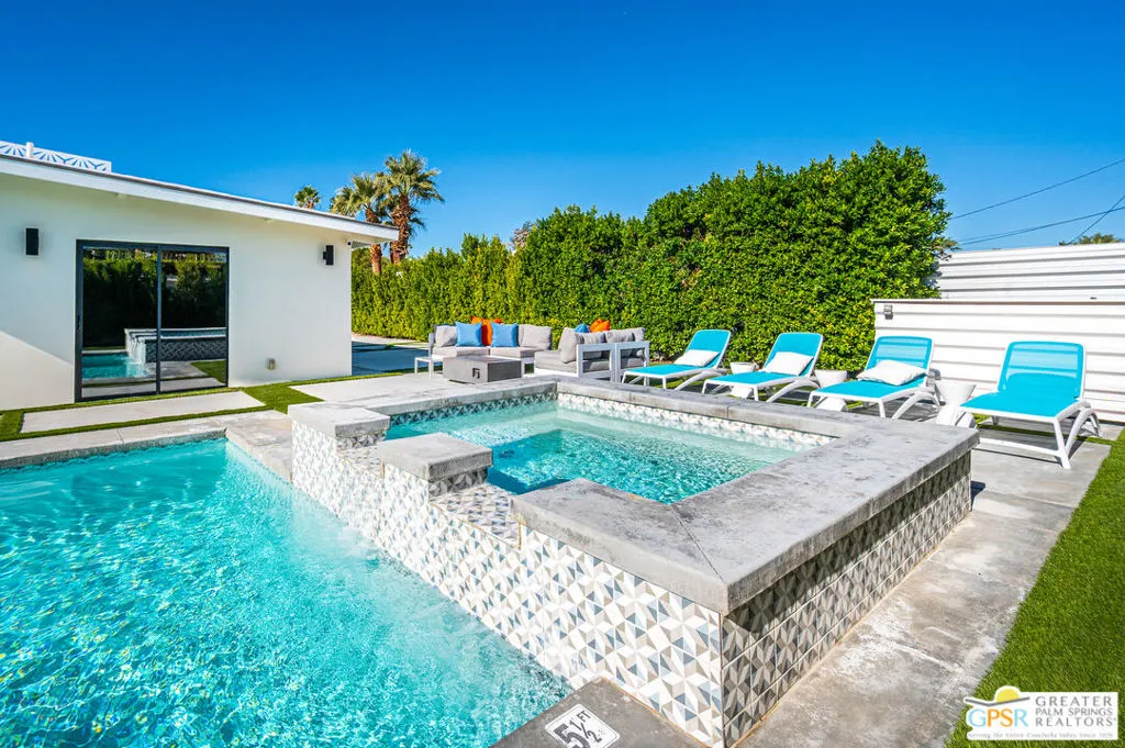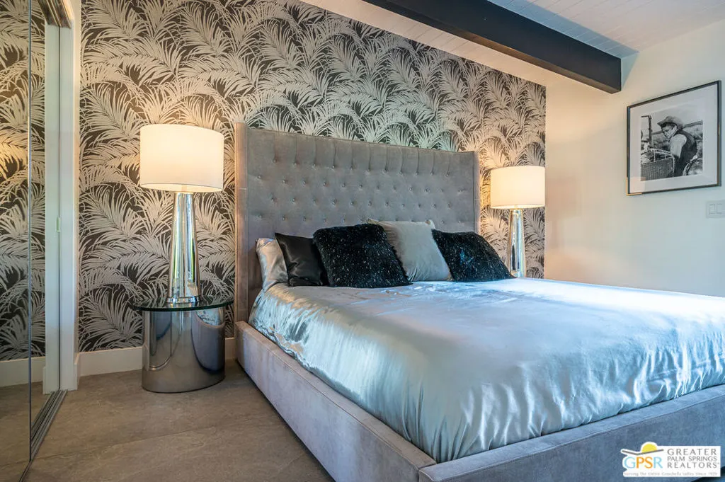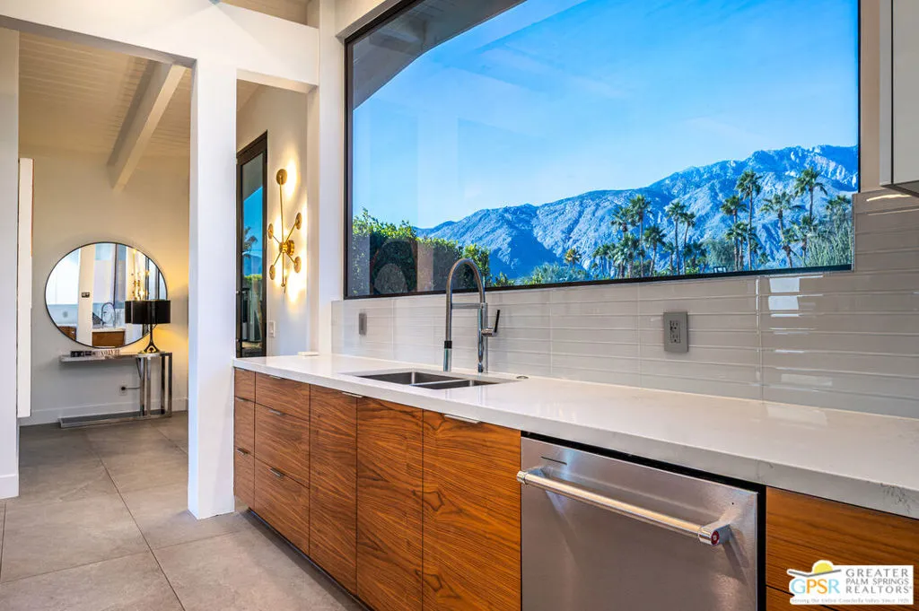 Wait! Stop searching you've found it. Mid-Century? Check! Stunningly re-imagined? Check! Pool? Check! Spa? Check! 4 Bedrooms + 3 Bathrooms? Check! That's right this one checks every box and is ready for you to move in NOW. Built in 1959 by iconic architects Palmer & Krisel, this Alexander Mid-Century Modern has 4 bedrooms, 3 bathrooms, and 2,465 sq ft. located in Racquet Club Estates. Extensively updated while preserving the magic of modernist desert living, the home features classic post-and-beam ceilings, an inviting open floor plan, and design-forward upgrades throughout. The chef's kitchen showcases walnut cabinetry, a large island, porcelain flooring, and San Jacinto mountain views. Living and dining spaces with walls of glass and sliding doors open to the outdoors creating amazing flow. Recent interior design enhancements include a dramatic custom walnut feature wall in the main living area, with bar cabinetry refaced to perfectly match both book-matched and butt-matched for a cohesive, high-end look. A cabinet-depth Bespoke Gallery refrigerator seamlessly blends into the kitchen cabinetry. The entire interior was freshly painted, while the primary suite now features a custom walnut bed wall, plus a newly added walk-in closet offering exceptional storage. The outdoor living experience was completely reimagined in 2024 and is nothing short of resort-caliber. The private backyard features new concrete and AstroTurf, extensive Ficus landscaping along the perimeter, and a freshly acid-washed pool and elevated spa with waterfall. A fully functional outdoor kitchen with plumbing, new countertops, and a louvered pergola anchors the space, complemented by a fire pit connected to natural gas .The front yard was also upgraded in 2024, featuring a new paver patio, mature transplanted palm trees, AstroTurf, and a pre-installed sleeve for a future natural gas connection ideal for a fire feature or outdoor heater. From a systems and technology standpoint, this home shines: Owned rooftop solar on NEM 2.0, paired with two SolarEdge 9.7kWh batteries App-based Pentair pool system Lutron smart lighting and Ring security system with remote access. EV charging station near the RV parking area HVAC and mechanical systems are approximately five years old. The 2-car garage features a tiled floor and a mini-split system, making it ideal as a gym, studio, or additional entertaining space. Behind gates on the north side, you'll find RV parking with power, offering flexibility rarely found in this neighborhood. The foam roof was redone in 2021 with a transferable warranty, and the entire exterior was freshly painted in 2024, completing the package. A rare blend of architectural pedigree, thoughtful upgrades, and modern luxury this iconic Mid-Century residence is ready to be enjoyed for years to come.