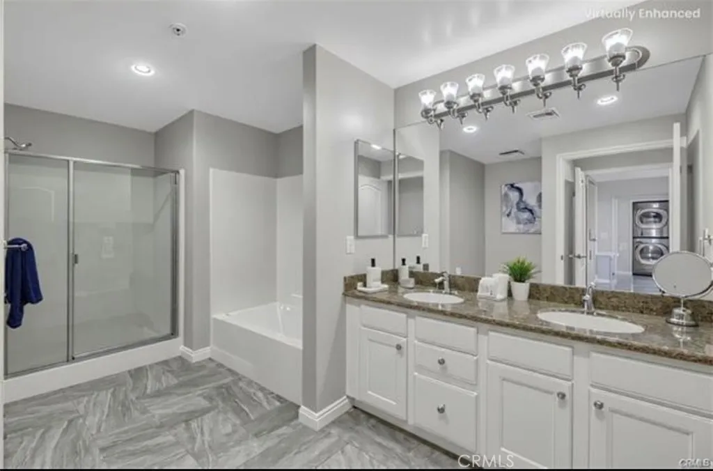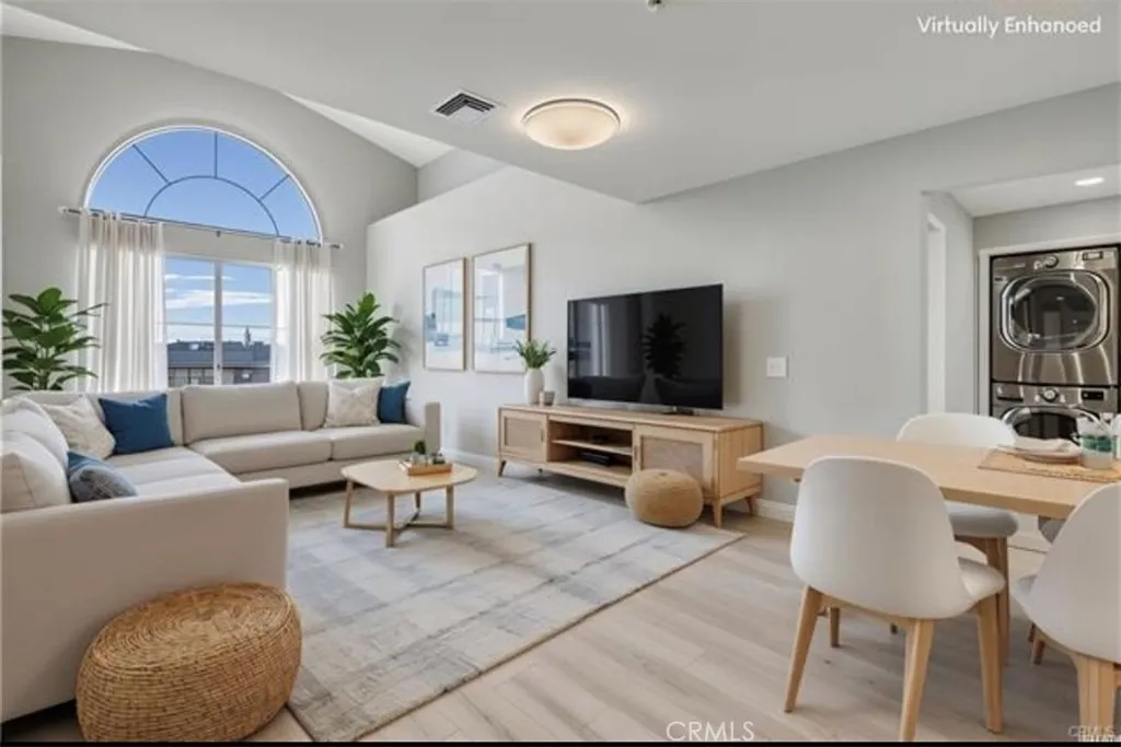 Modern, Sophisticated and Spacious Penthouse Unit, built in 2007. The Corbin Villa building boasts modern life style reflects true pride of ownership. This top floor residence offers exceptional privacy and sophistication, featuring soaring vaulted ceiling that fills the home with abundant natural light. The kitchen showcases stainless appliances. Contemporary laminate flooring, smooth ceilings, recessed lighting give the home a clean, modern feel. East-West bedroom layout creates a unique and comfortable living experience. The primary suite offers a true sense of retreat, featuring a generous closet space and a spa-inspired en-suite with dual vanities, a separate soaking tub, and a stand alone shower. This unit has Eastside primary bedroom and West-side second bedroom which makes it an ideal living situation in addition to a den/office. Additional storage can be found throughout the unit, along with an in-unit washer/dryer for added convenience.Two assigned spaces in a secured underground garage and six guest parking spots make parking effortless. Ideally located for quick access to all parts of the Valley, this penthouse condo combines comfort, style, and practicality—perfect as your next home or an exceptional investment opportunity.
