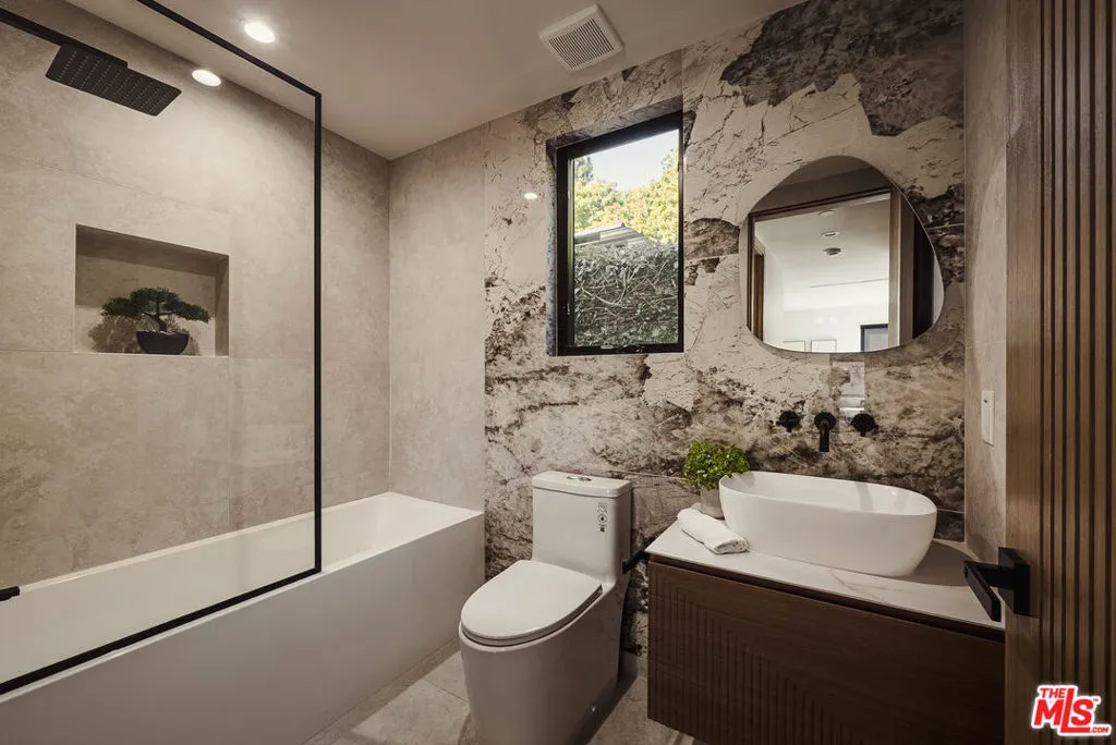 Experience modern luxury in this fully reimagined, 3-bedroom, 3-bath villa nestled in the heart of coveted West LA. Beyond the striking front entry with its custom metal door, an open living area seamlessly connects to the designer kitchen and two spacious ensuite bedrooms on the main level. A built-in wine display elegantly anchors the space under the staircase, adding a refined touch - the main living area flows effortlessly into a firesided family room framed by expansive Fleetwood glass doors that open to a private, resort-style backyard complete with an outdoor kitchen, pool & spa, and fire pit, all surrounded by mature ficus for ultimate seclusion. Up the sunlit staircase awaits the primary suite, a tranquil retreat featuring a generous walk-in closet, spa-inspired bath, and a sprawling west-facing deck perfect for enjoying the afternoon sun and evening breezes - tailored perfectly and fully furnished for the most discerning buyers.