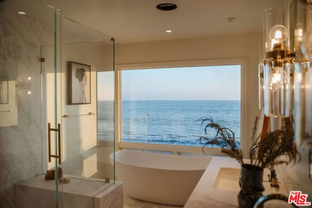 A newly renovated ocean front home located on the most coveted sandy stretch of Malibu, Carbon Beach. Masterfully renovated down to the studs, 22440 Pacific Coast Highway spans 5-BR, 4-BA, and 3,200-SF, featuring oak wood floors, natural stone finishes, and a neutral palette that invites grounded luxury. Walls of glass frame breathtaking ocean views, infusing interiors with light and restorative calm. With 9' ceilings, clean lines, and finishes chosen for both beauty and longevity, the home delivers effortless beachfront living. The kitchen, outfitted with Miele appliances, Calacatta Vagli countertops, and a waterfall island, is an organic-luxe centerpiece designed for wellness-driven living. Upstairs, the primary suite offers vaulted ceilings, an oceanfront terrace, a walk-in closet, and a spa-inspired soaking tub with Calacatta stone accents. Outdoors, the pool deck and seamless indoor-outdoor flow create a serene, sun-drenched retreat. Moments from Nobu, Malibu Pier, and local shops, this move-in-ready sanctuary embodies elevated, modern beach living on Carbon Beach.