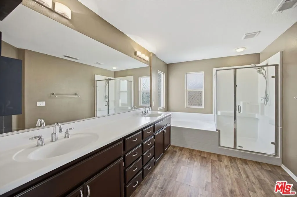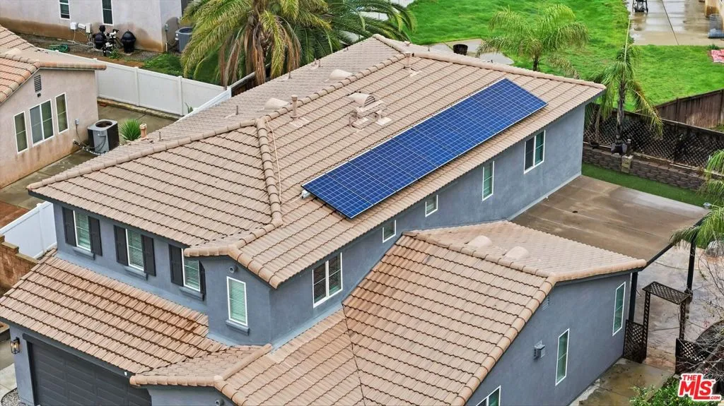 Spacious and inviting 6 bed, 2 and 3/4 ba home with a bedroom and bath on the first floor, offering flexibility for today's lifestyles. This home features recessed lighting, vinyl flooring, newer interior paint, and a bright, open feel throughout. The family room flows seamlessly into the kitchen, highlighted by curved entry doorways and a cozy fireplace perfect for everyday living and entertaining. The large kitchen offers generous cabinet space and includes a microwave, stove, and dishwasher. Enjoy year-round comfort with central AC and heating, plus the added benefit of a solar system for energy efficiency. The spacious primary suite features a spa-inspired ensuite with dual sinks, soaking tub, and separate shower. Additional highlights include a laundry area with storage, front and backyard space, a covered patio ideal for BBQs, an outdoor Jacuzzi, and ample parking with a 2 car garage and 2 car driveway.