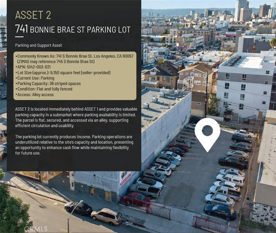 Updated as of 4/10/2026.-AUCTION SALE: Century 21 Masters and FRE Auctions are pleased to present this Online Auction Plus Event. STARTING BID: $1,500,000. PACKAGE INCLUDES TWO ADJACENT ASSETS. • ASSET 1: Fully occupied two-story office building located at 1833 W 8th Street (APN: 5142-006-009), totaling approximately 20,600 rentable square feet on an approximately 12,023 SF C2-1 zoned lot, providing stable in-place income with significant upside as current rents are below market, offering a strong opportunity to stabilize and increase cash flow. The asset reflects an estimated 5%–6% in-place cap rate based on current NOI and generates approximately $400,000 in gross annual income with stable occupancy (26 tenants). • ASSET 2: Separately parceled parking lot located at 741 S Bonnie Brae Street (APN: 5142-003-021), featuring approximately 36 striped spaces with alley access on an approximately 9,150 SF R4-1 zoned lot, offering existing income and strategic value in a dense, transit-oriented area with limited parking supply. The assets are adjacent and operate as a unified investment, offering control of income, parking, and future optionality. Combined land area is approximately 21,173 square feet, near Downtown Los Angeles and Koreatown. Property offered via auction with reserve. All offers must be submitted through the auction platform. Seller reserves the right to accept, reject, or negotiate offers prior to or after the bidding period. Buyer to assume all existing tenants. Property sold AS-IS. All information deemed reliable but not guaranteed. Buyers to conduct their own due diligence.