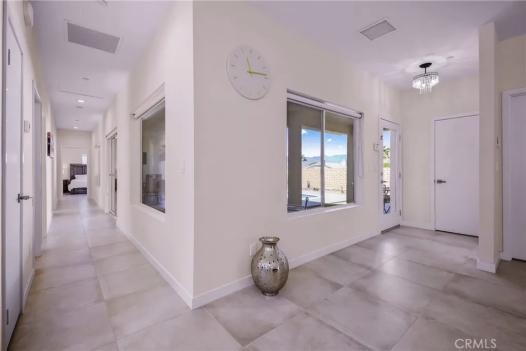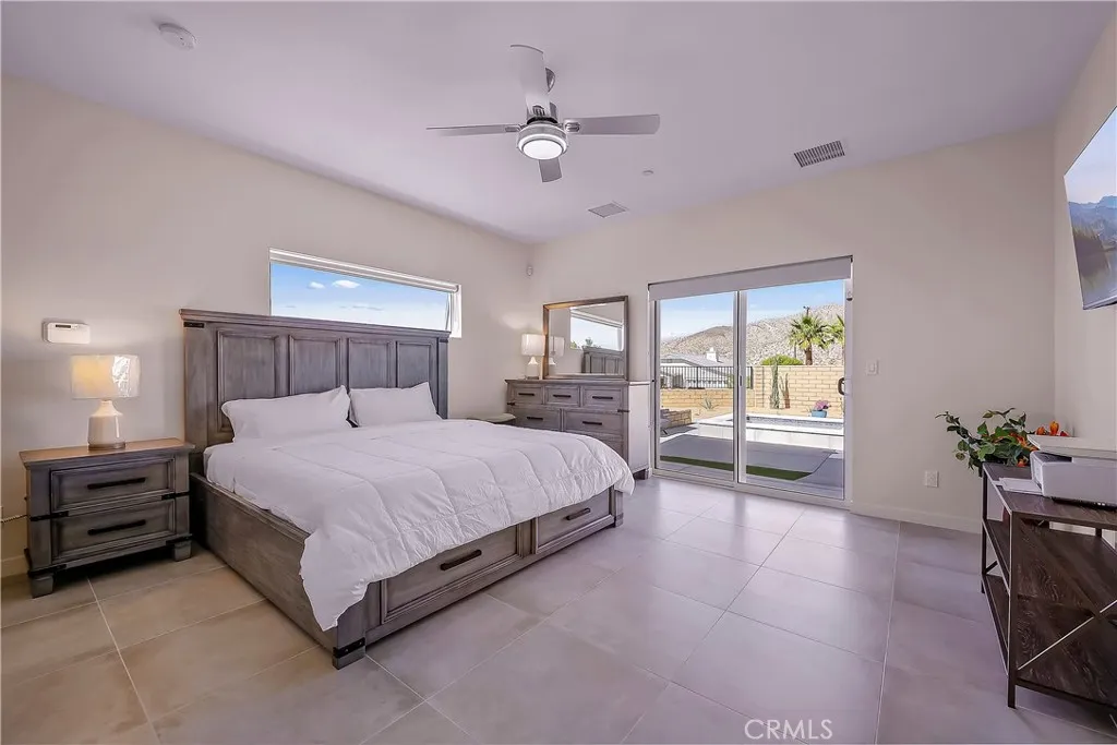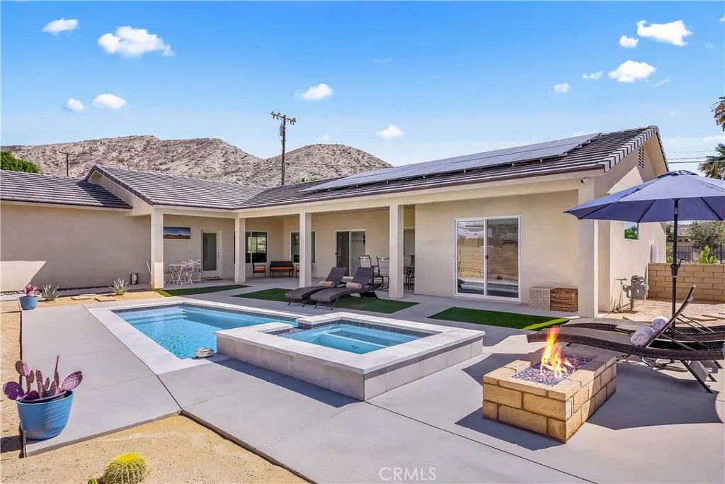 NO HOA. PAID OFF SOALR PANELS. SELLER CREDITS $9,000 TOWARD BUYER CLSOING COSTS. Perched on a hilltop with sweeping views for miles, this striking modern home—NEWLY COMPLETED in 2022—offers the perfect blend of style, comfort, and income potential. This 3-bedroom, 2-bath residence is fully furnished, move-in ready, and ideal for a primary residence, start-up home, or income-generating property. Designed with an open floor plan and natural light, the home seamlessly connects the kitchen to the living area and opens to a beautifully lit, inviting front courtyard. Here you’ll find a heated pool and spa, powered by top-of-the-line Hayward natural gas equipment, where you can unwind while enjoying breathtaking views of Mt. San Jacinto. The SOLAR PANELS are FULLY PAID OFF, adding long-term energy savings. The low-maintenance landscaping features drought-tolerant plants and ground cover, perfect for desert living. Quality and attention to detail are evident throughout, including 9-foot ceilings, ceramic tile flooring, blackout shades, custom shower doors, and a high-end alarm and camera system. The serene primary suite features a clerestory window, offering stunning sunrise and sunset desert views. From the moment you step onto the property, you’ll recognize this home as an exceptional desert retreat—beautifully finished inside and out, thoughtfully designed, and ready to enjoy.