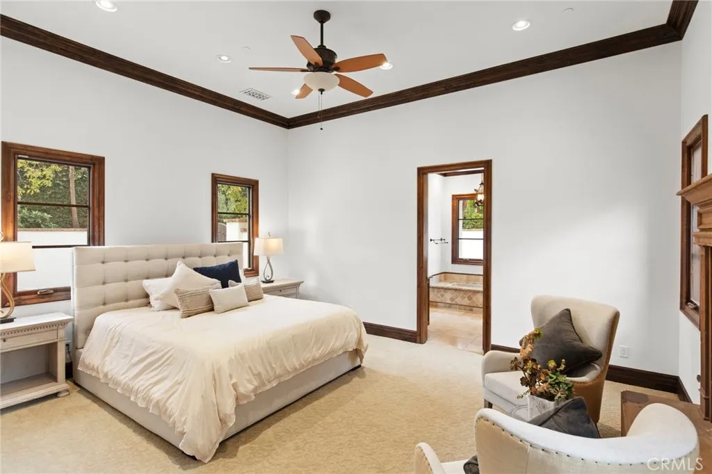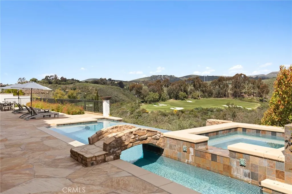 Spectacular panoramic views in The Bridges at Rancho Santa Fe! Overlooking the signature 10th hole green & fairway, this stunning 5 bedroom / 8 bathroom home features a highly functional floor plan designed to maximize both privacy and views. As you enter the home from the private gated courtyard, you are greeted by soaring ceilings and expansive views of the golf course, hills and an iconic community bridge. The open floor plan flows seamlessly from room to room, providing the perfect space for entertaining and relaxation. The gourmet kitchen features high-end appliances, a large center island and a breakfast counter. The adjacent family room is warm and inviting, with wet bar, a grand fireplace and patio doors that open to the outdoor living area. The luxurious owner’s suite is a private retreat with a fireplace and resort-like bathroom, complete with sauna, soaking tub, dual vanities,generous walk-in closets, and glorious hillside & golf course views. Four additional bedrooms, each en-suite provide ample space for family and guests. Additional amenities include a dedicated movie theater, office, and formal dining room. Outside, the resort-style backyard is an oasis of tranquility, with a sparkling infinity pool & spa, outdoor kitchen and dining area, and an intimate covered loggia seating area with a large fireplace. This exquisite estate offers the ultimate in luxury living in one of Southern California's most coveted communities.