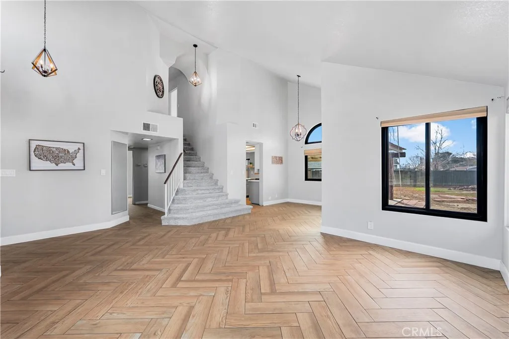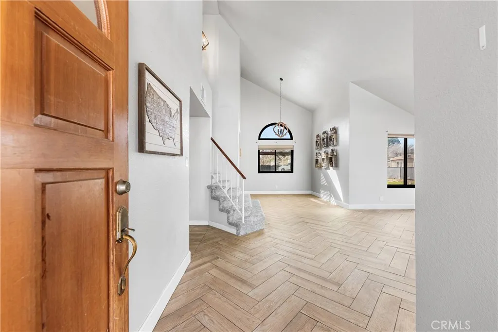 Step inside and be greeted by soaring vaulted ceilings that create a grand entrance and showcase the elegant staircase—a beautiful focal point of the home. The custom wood-grain tile flooring runs throughout the downstairs, while the upstairs features brand-new carpet for added comfort.