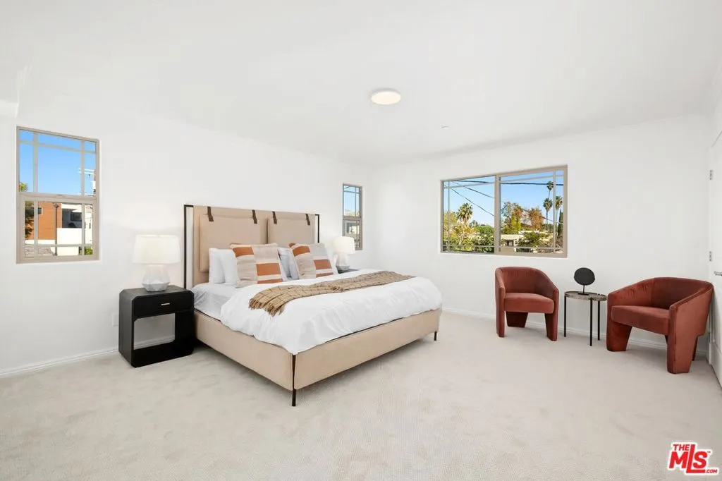 Spacious, light-filled, & thoughtfully designed, this contemporary 4-bedroom, 3.5-bath residence offers over 2,200 square feet of flexible living space with a private yard & attached garage in a prime Hollywood location near Hancock Park, local shops, dining, & major studios. The property is part of a small-lot subdivision with no HOA. Enter through the first level which features a bedroom with en-suite bath (staged as office) that grants access to a hedged back yard. Take the sweeping staircase to the main level that includes generous open living + dining areas w a balcony, powder room, & large kitchen offering dual sinks & stoves. The top floor provides a spacious primary w en-suite bath, 2 additional bedrooms with a Jack-and-Jill bath, & laundry area. This is an ideal opportunity for both an owner-user or a low-maintenance rental investment.