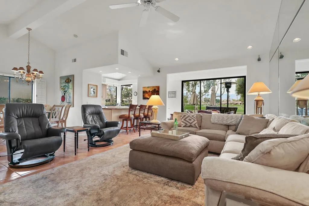 This prized, expanded Abilene End-Unit has amazing panoramic views: Majestic Mountains, Double Fairways, Lakes, Fountains, and Waterfalls. Two new AC Units in 2022. This light & bright remodeled open-concept living area now includes incredible entertaining space with custom recessed lighting throughout, 4 Ceiling Fans, and 5 Skylights. The Abilene floor plan is one of only two floorplans in The Lakes that allows for convenient direct access from the garage to the home through your full Laundry room. This home comes furnished, so move right in. The atrium is converted for an extra-large Den/3rd Bedroom, including a cozy office space. The Pet-Friendly Patio provides fabulous outdoor living/entertaining. The Lakes Country Club has: 27 championship holes designed by Ted Robinson, 23 Racquet courts incl 10 tennis (8 Hard, 2 Clay), 4 Pop/Paddle ball, and 9 Pickle ball with lit courts in all categories. The Lakes Picnic Grounds have 4 new Bocce ball courts, multiple grills, a playground w/ basketball court, and a mistered & lit shelter for public and private event use. The state of the art Fitness Center and spa (2021) is unsurpassed, including a 4-lane chilled lap pool. The elegant and active clubhouse hosts social activities year-round with a linear firepit and large outdoor entertaining areas.