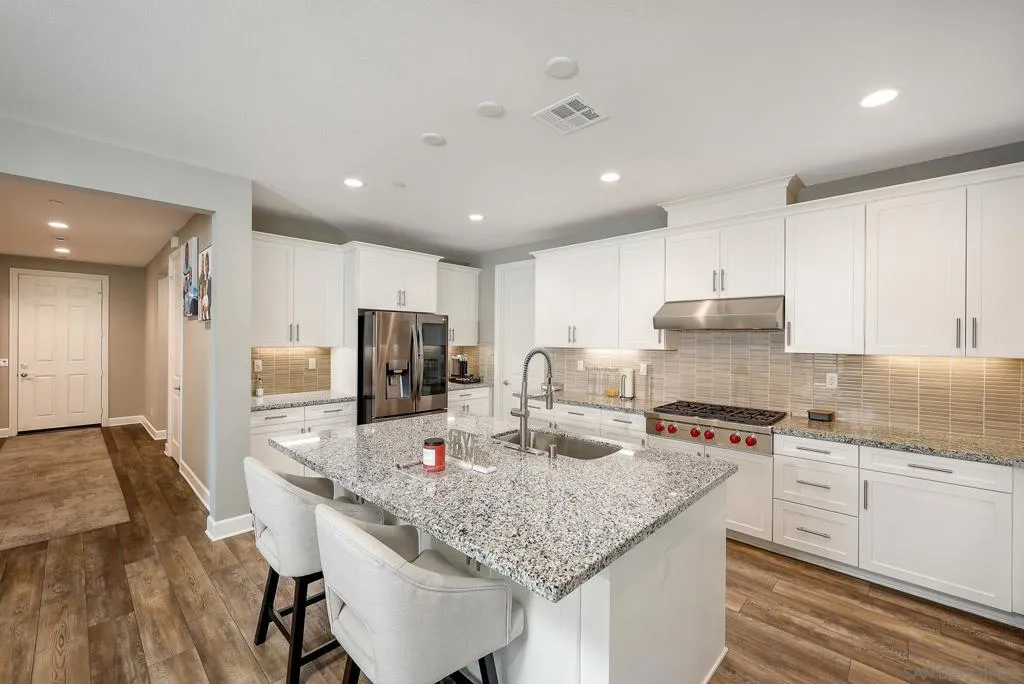 Discover your perfect sanctuary located in the exclusive Ridgeview Community. This move-in-ready, single-level home features an open and airy layout ideal for relaxing or entertaining, enhanced by custom designer touches such as a custom closet barn door and a stylish bathroom barn door. The chef’s kitchen includes Wolf range and a Wolf oven along with an LG washer and dryer, LG refrigerator, and three LG OLED Smart TVs for immediate move-in comfort. Efficiency upgrades include premier hardwood shutters paired with honeycomb room-darkening shades, a striking multi-slide patio door, an owned 6-panel solar system, and ENERGY STAR enhancements such as Low-E dual-glazed windows, a tankless water heater, gas furnace, and smart thermostat. Additional highlights include a pristine finished garage with epoxy flooring, slat walls, overhead storage, a closet, and EV-charging capability. Exceptional curb appeal is showcased through custom landscaping and Belgard pavers. Situated in a peaceful, prideful neighborhood with a warm and welcoming atmosphere, this home offers exceptional convenience—minutes from Hwy 78, I-15, and the SPRINTER rail station, making commuting effortless. You’re less than 5 miles from Cal State U San Marcos and Palomar College, surrounded by three parks, and have access to miles of hiking and mountain biking trails. Healthcare access is outstanding with a short drive to Tri-City Medical Center, Kaiser Permanente San Marcos, and Palomar Medical Center Escondido. This home blends comfort, convenience, and community in one of the area’s most sought-after pockets.