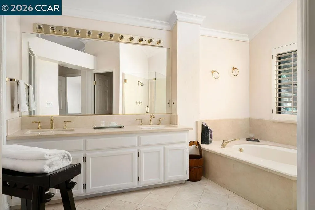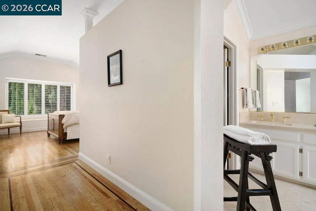 This 3-bedroom, 2.5-bathroom end-unit is located on an oversized, NORTH EAST FACING lot in Danville’s gated Blackhawk community. The home has been extensively updated with a brand-new roof, a new energy-efficient modern heat and air system and more. The interior features top-grade real oak hardwood flooring with custom walnut inlays and crown molding and baseboards throughout, including the closets. High-end Crema Marfil marble is featured in the entryway, the fireplace mantel, and the entire primary bathroom. The lower kitchen cabinets, pantry, and living room ceiling are freshly painted, and the home is accented by antique Art Deco chandeliers installed throughout the house and garage. The kitchen is upgraded with a new dishwasher, high-end appliances, and a wine cooler. All bathrooms are fitted with Kohler toilets. Outside, the property includes a newly stained waterproof deck, new fencing, and newer retaining wall made of pressure-treated wood. The garage is finished with durable rubber tiles. Includes Section 1 termite clearance. Located near Blackhawk Plaza and top-rated schools, this property combines major upgrades with high-quality custom finishes TRULY A MUST SEE!