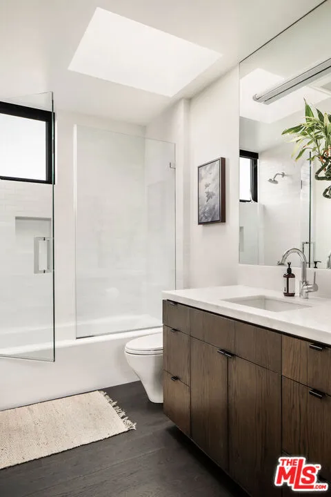 Nestled behind a veil of lush greenery, this striking residence by renowned architectural firm Marmol Radziner embodies the essence of California modernism: bold, sophisticated, and effortlessly livable. Completed in 2016, the home is a masterful interplay of refined materials, voluminous spaces, and seamless indoor-outdoor flow, offering an exceptional retreat in one of Los Angeles' most vibrant enclaves. The minimalist charcoal facade opens to interiors reminiscent of a classic Venice artist loft -- expansive, adaptable, and elegantly curated. Soaring ceilings and polished concrete floors define the main level, where a wall of sliding glass doors dissolves the boundary between the open-plan living area and the tranquil backyard oasis. The gourmet kitchen is a sculptural centerpiece, featuring solid oak cabinetry, dramatic Arabescato marble countertops, a full suite of Miele appliances, and a generous walk-in pantry equipped with a beverage refrigerator. A versatile bedroom suite on the first floor opens directly to the patio, ideal for hosting guests, establishing a home office, or cultivating creative pursuits. Upstairs, the serene primary suite features a custom oak headboard wall, dual walk-in closets, and a spa-like bath enveloped in handcrafted Heath tile. Two additional en-suite bedrooms maintain the home's minimalist aesthetic and invite natural light and treetop vistas through expansive aluminum-framed windows. A thoughtfully positioned skylight above the stairwell imbues the space with a soft glow, enhancing the architectural harmony across both levels. Balancing clean-lined simplicity with refined luxury, this residence supports a lifestyle rooted in design, ease, and connection to nature. Located just moments from the pulse of Venice, this home enjoys close proximity to the iconic Venice Beach and boardwalk, the trendsetting boutiques and acclaimed restaurants of Abbot Kinney, and a rich tapestry of neighborhood amenities that define the Westside's vibrant cultural fabric.