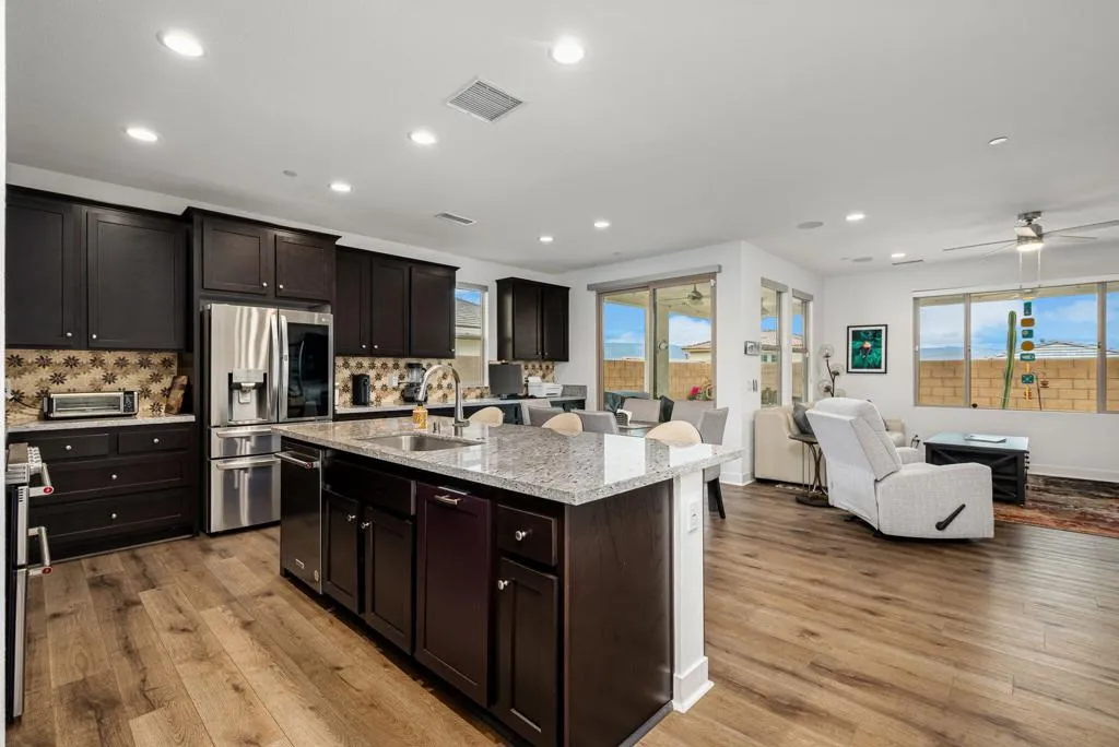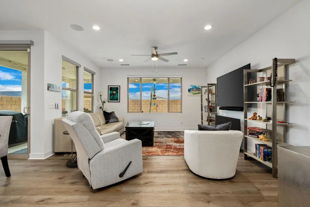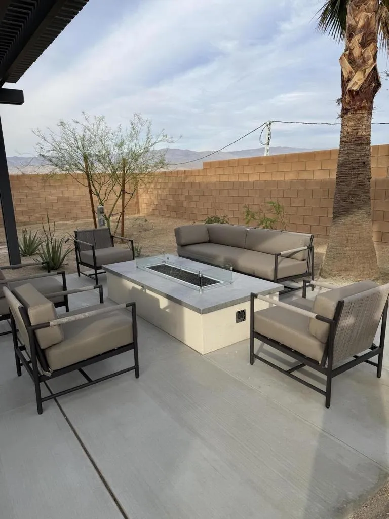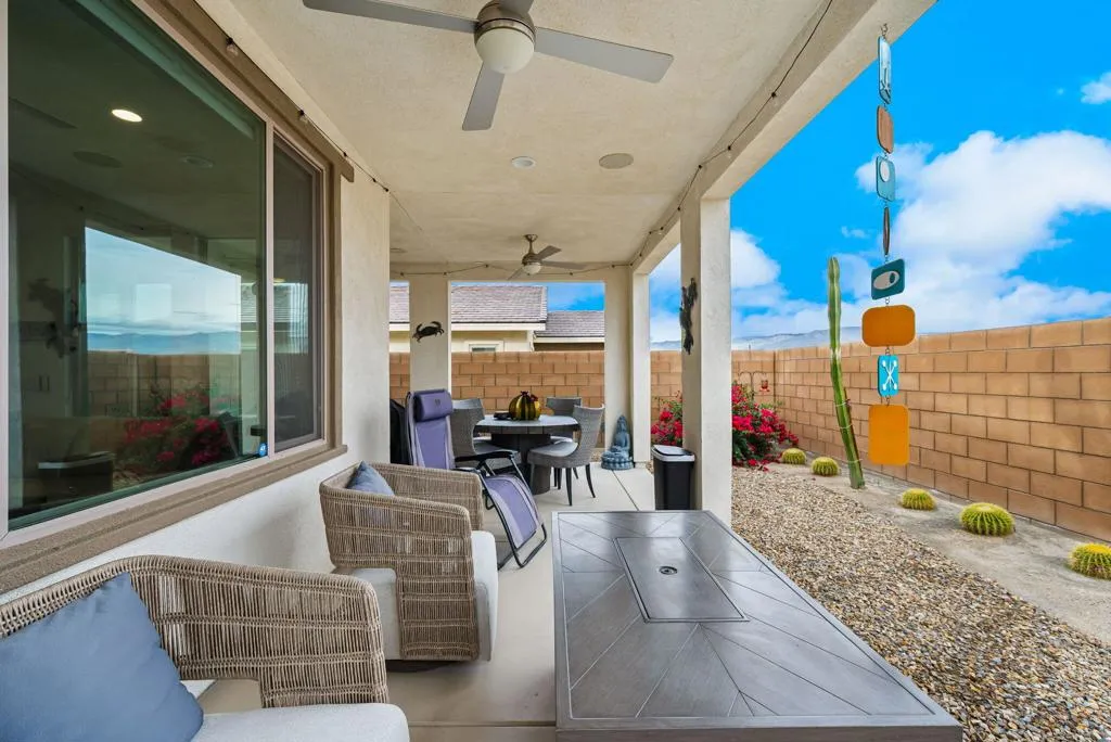 Owned Solar and all furnishings available! Seller is motivated. Welcome to Sage Palm Desert! Built in 2021 by Ponderosa Homes, this beautifully maintained single-story residence offers the benefits of newer construction without the wait. With the option of being fully furnished, this home provides a move in ready experience. The thoughtfully designed 3-bedroom floor plan showcases warm tones and modern finishes throughout. The open-concept living area flows seamlessly into a spacious kitchen featuring upgraded stainless steel appliances and a large island--ideal for both everyday living and entertaining. The large private primary suite features backyard views, dual vanity sinks, and a generous walk-in closet. Additional highlights include vinyl wood-look flooring, marble countertops in the kitchen and bathrooms, extended kitchen cabinetry, Milgard windows, new window coverings, and electric vehicle charging in the garage. Enjoy OWNED SOLAR for energy efficiency and low electric costs, along with a smart home system and wired alarm. Peek-a-boo mountain views from the main living area and patio elevate the living space. The backyard is designed for year-round enjoyment with a wraparound covered patio, ceiling fans, and low-maintenance landscaping. Sage Palm Desert is a gated community featuring a completed resort-style clubhouse with a pool, spa, and fitness center, offering a true desert lifestyle. Seller is willing to sell the home furnished or unfurnished making it a great second home or investment opportunity!