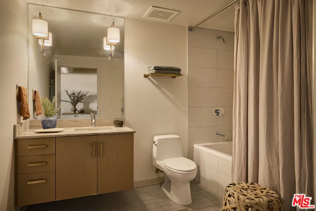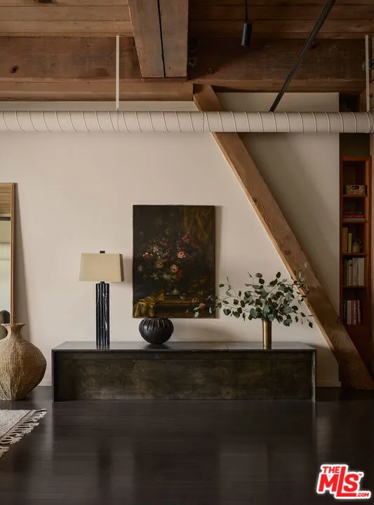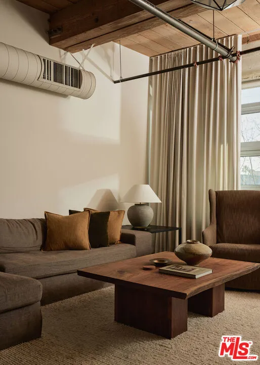 Exceptional Arts District loft in the historic Barker Block, exquisitely designed by noted interior design firm DISC Interiors. A dramatic wall of windows spans the far end of the residence, dressed in floor-to-ceiling drapery that adds warmth and texture, filling the space with an abundance of natural light and framing a coveted downtown skyline view. West-facing units with all wood ceilings and sunset exposures like this rarely come to market at Barker Block, making this residence an exceptional opportunity. This special home strikes a thoughtful balance of warmth and sophistication with hardwood floors throughout, nearly 11-foot ceilings with exposed beams, architectural lighting complemented by designer decorative fixtures, and custom built-in cabinetry providing ample storage at every turn for smart, elevated living. Warm white walls and painted-out ducting give the loft a more cohesive and softened feel. The heart of the loft is a chef's kitchen outfitted with top-of-the-line, recently updated appliances seamlessly anchoring the open layout, ideal for both everyday life and entertaining. A spacious full bath includes in-unit laundry, while the generously sized bedroom features luxurious custom curtains that provide privacy and a thoughtful separation of space. The bedroom is complemented by a large wall of custom designed closets with antique brass hardware, and a built-in wall-to-wall oak dresser. A custom built-in 16' desk with a full wall of bookshelves thoughtfully separates the entry and dining areas, adding both function and architectural interest.The Barker Block is a full-service building offering 24/7 front desk and security, complimentary common-area WiFi, an outdoor lounge with fire pits, and a resort-style rooftop with heated pool, spa, BBQ areas, and a fitness center showcasing some of the best panoramic views in downtown Los Angeles. Known for its striking architectural details and timeless industrial character, the live/work designated Barker Block also offers a dynamic and sophisticated creative community spirit.Located in the heart of the Arts District, moments from Bavel, Girl and the Goat, Verve Coffee, Blue Bottle Coffee, as well as walking distance to Still Life Ceramic Studios, Dover Street Market, Bestia, Soho Warehouse, and art galleries such as Hauser & Wirth, this exceptional loft delivers a rare blend of architectural pedigree, thoughtful design, and a vibrant, walkable urban lifestyle.