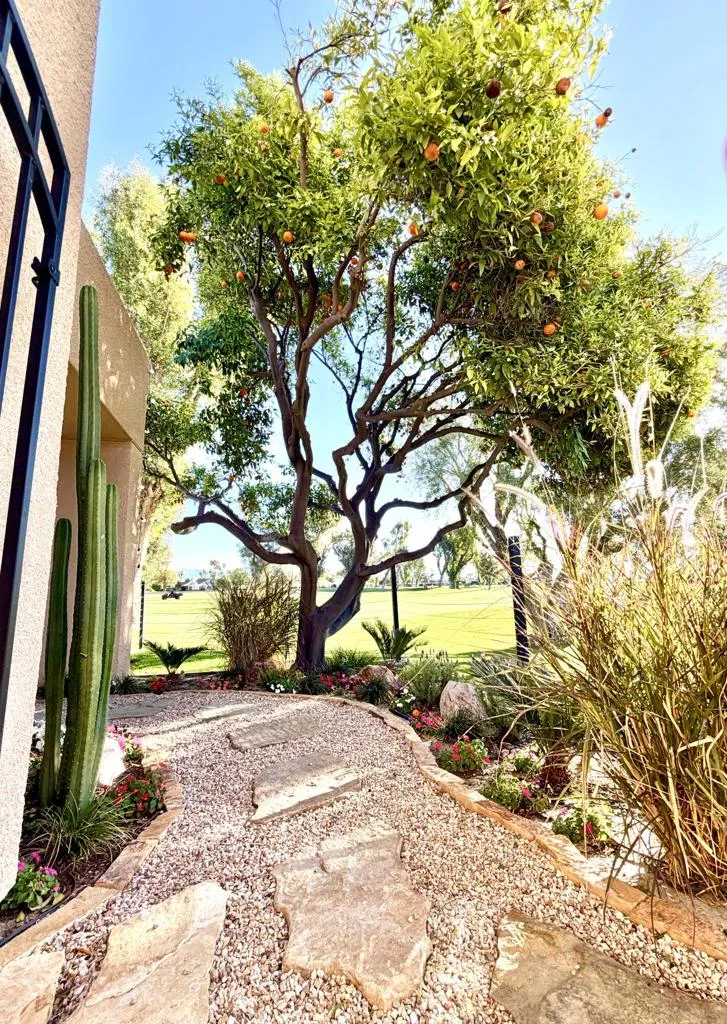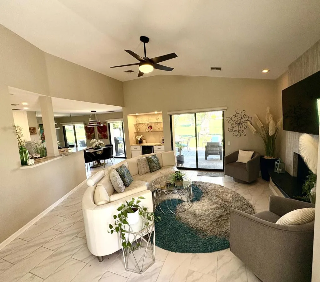 Live the resort lifestyle at prestigious Mission Hills Country Club with this beautifully remodeled golf course condo offering stunning views and exceptional privacy. This turnkey home features an open, light-filled floor plan with high ceilings that makes the space feel far larger than its square footage. The custom-designed kitchen includes stainless steel appliances, new cabinetry, sleek quartz countertops, and a raised bar perfect for entertaining. Both bathrooms have been fully updated with tiled walk-in showers, glass doors, and custom vanities. Enjoy new tile flooring throughout the main living areas, plus plush Berber carpet in both bedrooms. The living space showcases a stunning custom fireplace and wet bar with built-in wine fridge, ideal for relaxing or hosting guests.Pet-friendly, Gated front courtyard + large fenced back patio, Beautiful golf course views, 2-car attached garage, Refrigerator + washer/dryer included.Land lease paid through 2125. HOA covers exterior maintenance, roof included. Trash, cable, and internet. Dwelling Insurance, landscaping and Gated community.A fully remodeled home in one of the desert's most sought-after communities. Come see it in person - must be experienced to be appreciated. Furnishings available.