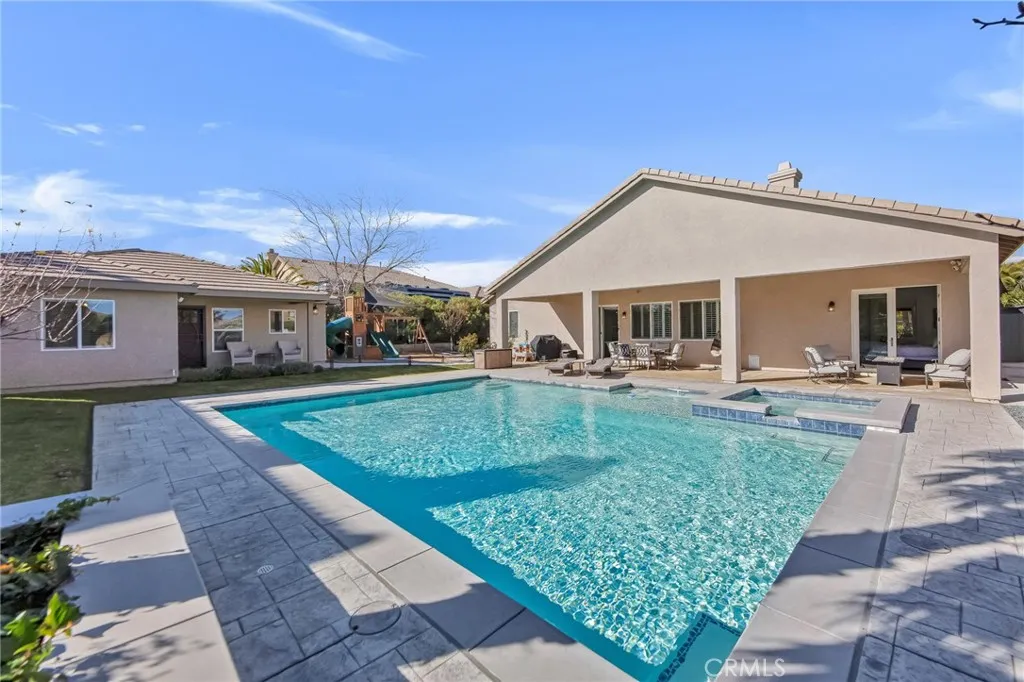 Step outside to a private backyard oasis—professionally landscaped with a large POOL AND SPA, custom removable pool fence, PLAYGROUND area, lawn, fruit trees, rose and lavender bushes, and raised garden beds.