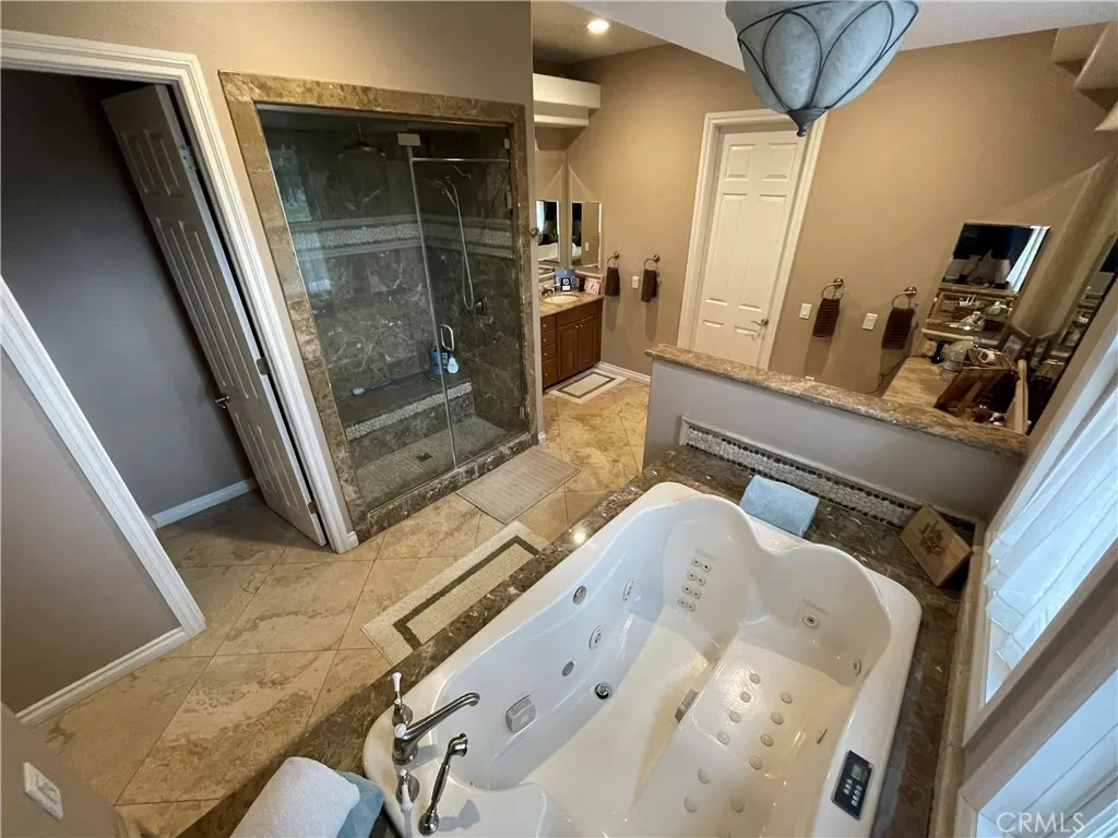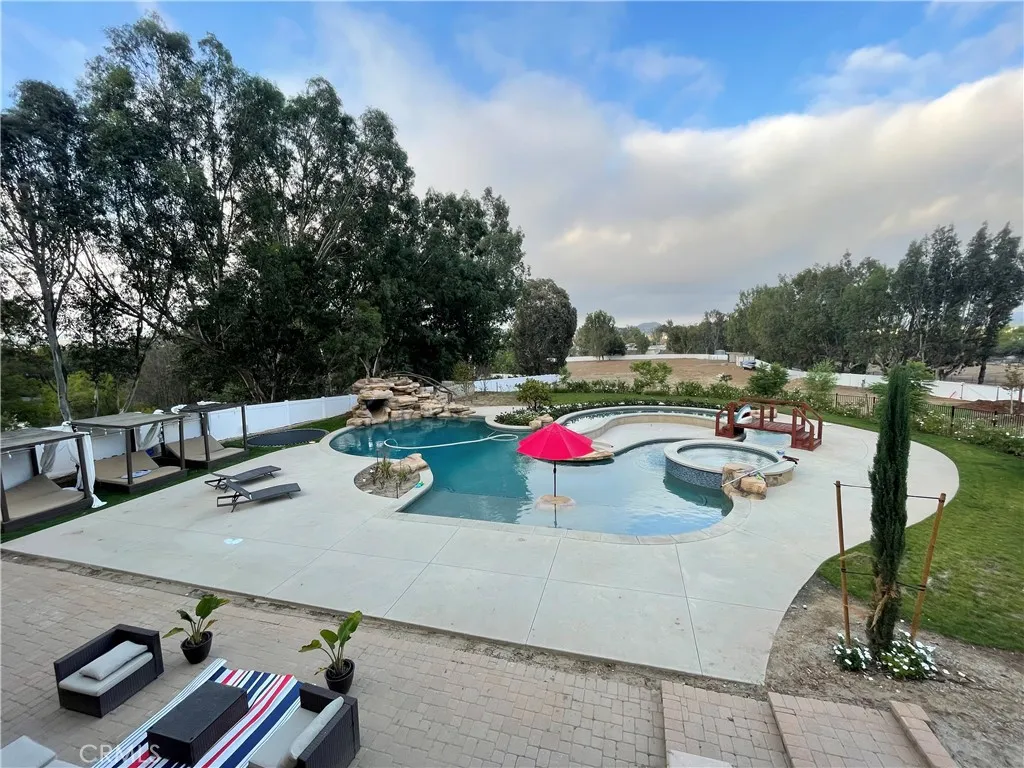 One-of-a-Kind Resort Estate! Welcome to an extraordinary private estate offering a rare blend of architectural grandeur, resort-level amenities, and multi-residence flexibility on 4.85 lushly landscaped acres zoned for residential rural living with equestrian potential. Designed for elevated living and unforgettable entertaining, this property features two separate single-family homes anchored by a world-class pool, spa, and lazy river experience rarely found in Southern California. The main residence spans three impressive levels and showcases refined craftsmanship, scale, and thoughtful design throughout. The home offers five spacious bedrooms, including three upstairs bedrooms featuring a Jack-and-Jill bath plus a private en-suite, and two luxurious primary suites on the main level—one with its own private entrance, ideal for multigenerational living, guests, or executive accommodations. The main level is appointed with an elegant formal dining room, a private office, and an expansive chef’s kitchen equipped with Sub-Zero refrigeration and high-end appliances, thoughtfully designed to serve both daily living and large-scale entertaining. Two laundry rooms—one upstairs and one downstairs—add everyday convenience and functionality. Living spaces flow seamlessly to a stunning elevated deck overlooking the resort grounds, offering panoramic views of the pool, lazy river, and landscaped acreage below. The lower level transforms into a private entertainment retreat, featuring a custom movie theater, fully equipped gym, bar, game room, and an additional full bath—creating the ultimate destination for hosting, relaxation, and recreation. Outdoors, the estate truly shines. A resort-caliber pool and spa with a winding lazy river serve as the centerpiece, surrounded by expansive patios, lounging areas, and mature landscaping that delivers both beauty and privacy. The nearly five acres of usable land provide endless opportunities for equestrian use, gardens, recreation, or future enhancements, all while maintaining a serene, secluded atmosphere. A separate second residence offers exceptional versatility—perfect for extended family, guests, or private use—completing this rare compound-style offering. This is not simply a home, but a destination estate—where luxury, lifestyle, and privacy converge. An exceptional opportunity for the discerning buyer seeking space, flexibility, and resort living in one of Murrieta’s most coveted residential rural settings.