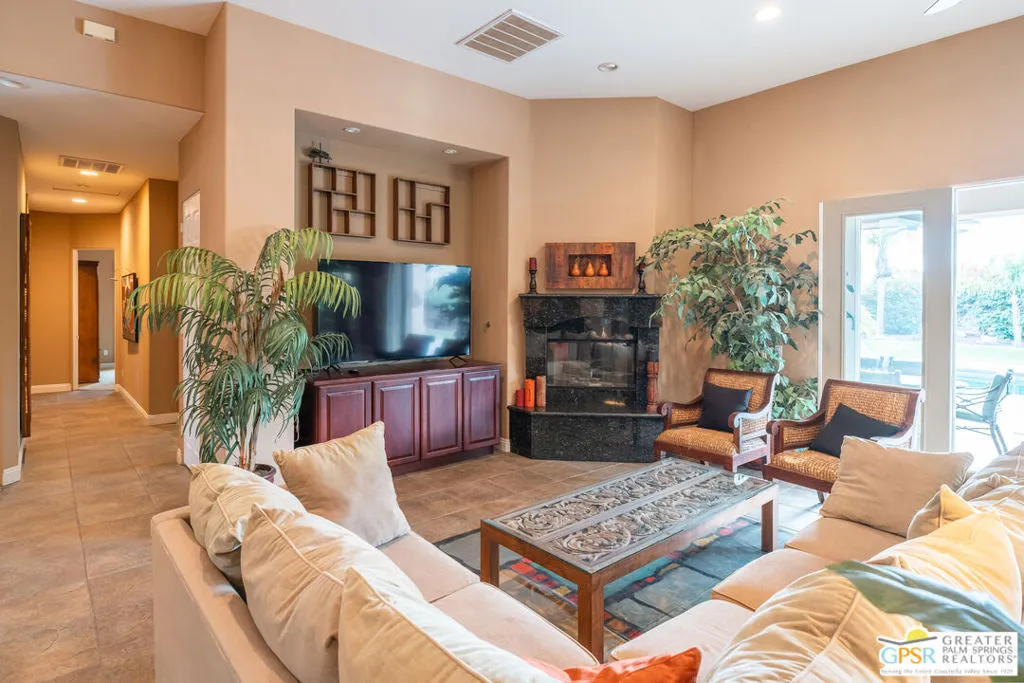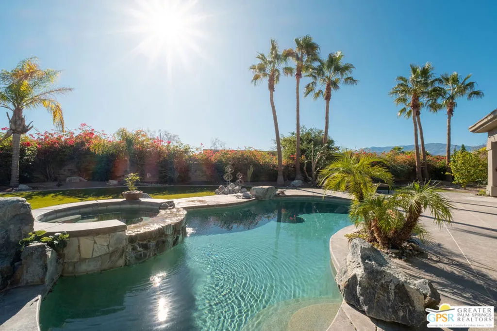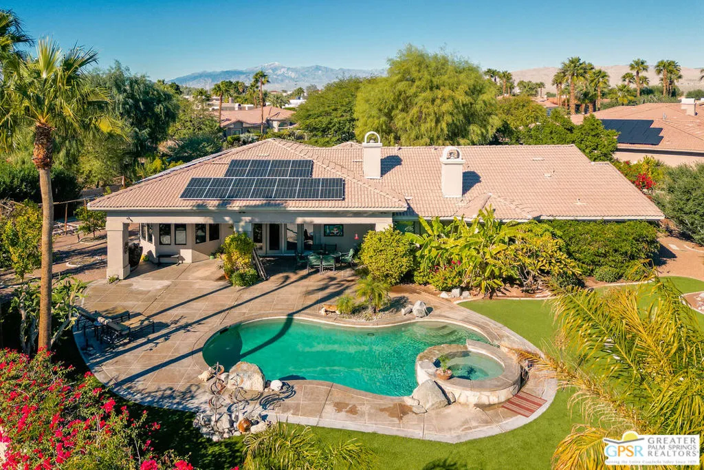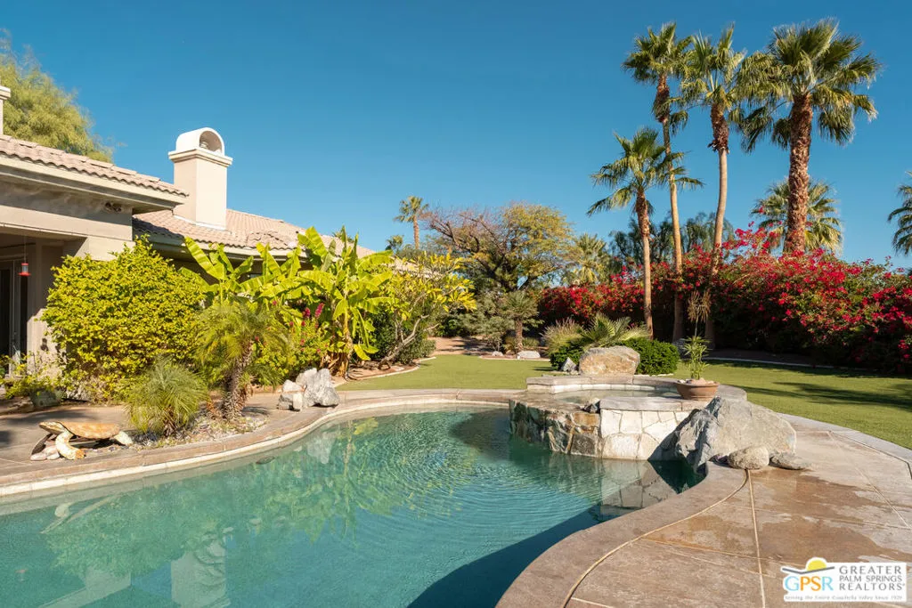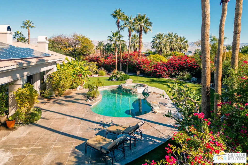 Welcome to your private escape within this contemporary Mediterranean oasis. One of just ten homes in a gated community, this professionally designed residence offers three bedrooms plus a den/office, three bathrooms, and sits on an expansive lot of over 16,000 square feet at the end of the cul-de-sac.From the moment you arrive, you are welcomed through a gated front courtyard adorned with lush landscaping and a tranquil bubbling fountain. Inside, the foyer showcases soaring ceilings and generous wall spaceideal for displaying art and treasured collections. The open living areas are both gracious and well defined, featuring a breakfast nook with bay windows, a formal dining area, and a comfortable living room anchored by a fireplace.The open kitchen is perfectly suited for both everyday living and entertaining, offering guest seating and a spacious pantry. French doors off the south-facing living area open wide to invite natural light and breezes, leading to a private lanai and BBQ, surrounded by verdant backyard complete with a custom salt water pebble tech pool and slate rock waterfall spa.The oversized lot provides ample room for a future ADU and includes a generous garden area with mature fruit treesincluding Lemon, Mexican Lime, Pomegranate, and Fig. Ideal for those with a green thumb. Back inside, the primary bedroom is a true retreat, featuring French doors that open to a seating area and a spa-inspired bath, large walk-in closet, and a fireplace. With direct access to the backyard, the suite offers seamless enjoyment of the outdoor spa on relaxing evenings.Just across the hall one will find a flexible room (listed on records as the fourth bedroom) that opens to the front courtyard and serves beautifully as an office, media room, or creative space.Continuing down the hall, you'll find a convenient powder room with nearby linen storage, along with two additional bedrooms that share a full bathroom. Additional amenities include a three-car garage, a spacious laundry room with extra storage, paid-for solar panels (installed but not connected), and a dual-zone HVAC system.This sophisticated home offers remarkable versatility ideal as a full-time residence, weekend retreat, work-from-home haven, or peaceful escape from the bustle just beyond. Conveniently located near Mission Hills Country Club and a short drive to shopping and dining, this quiet, well-maintained community offers a truly special desert lifestyle.