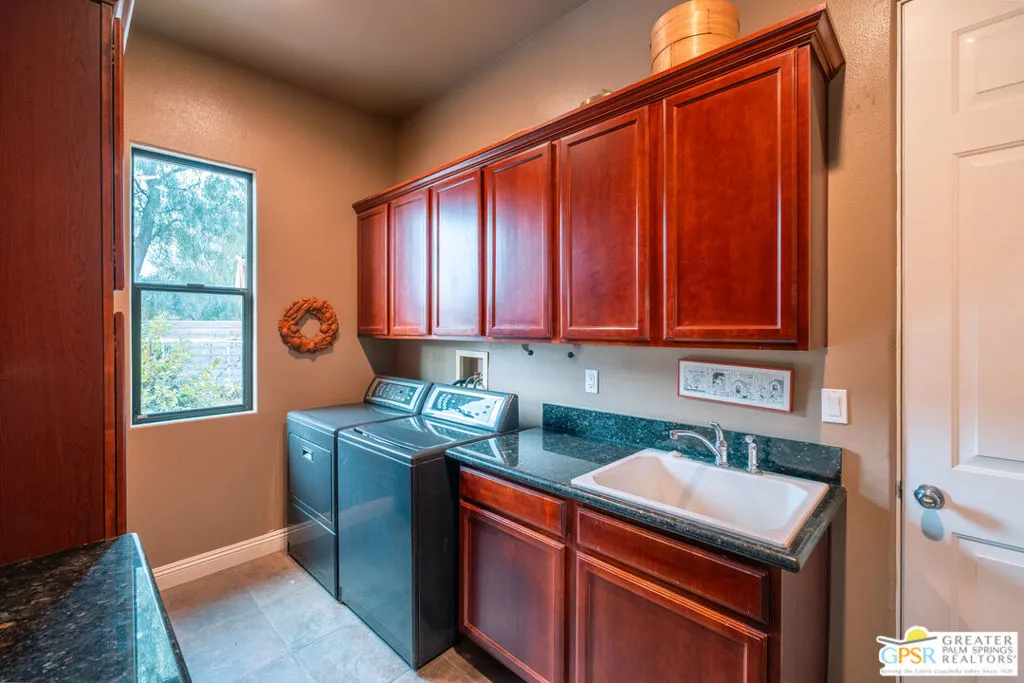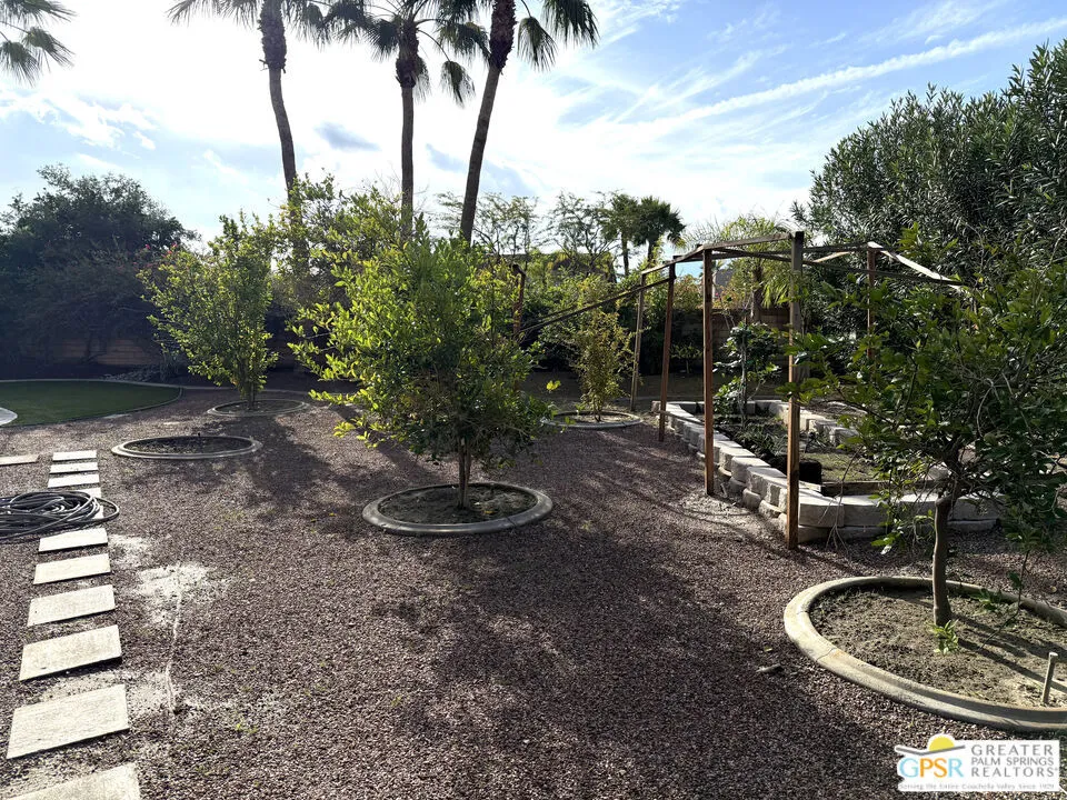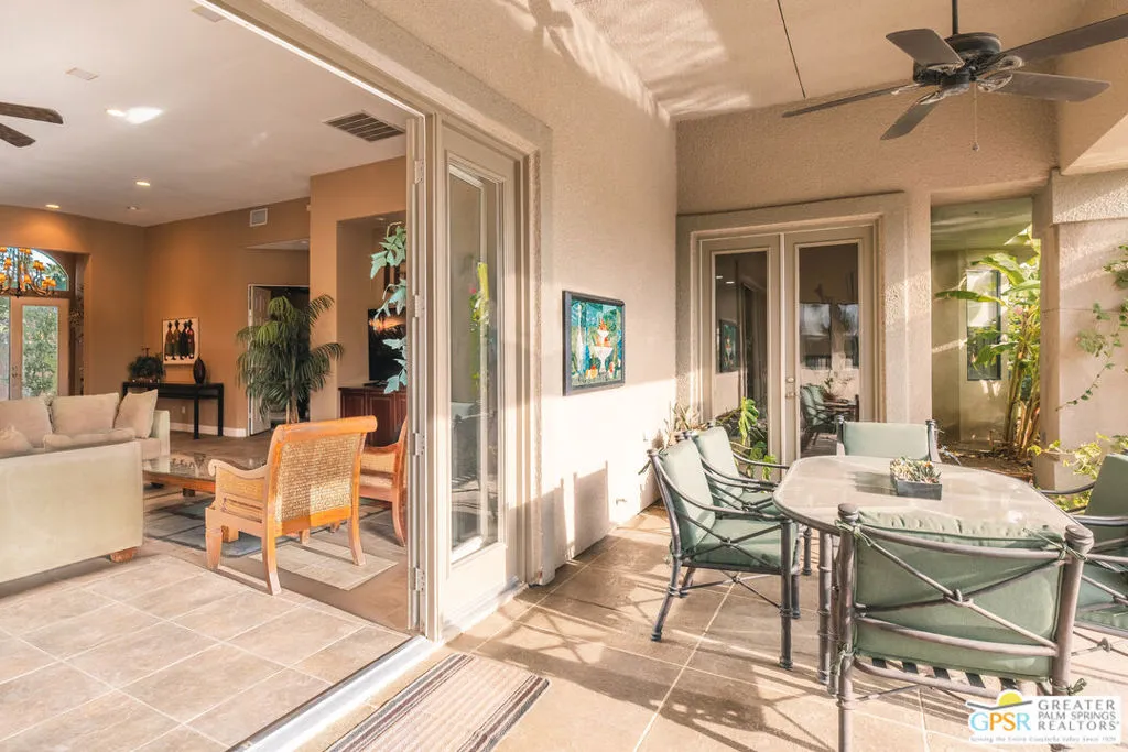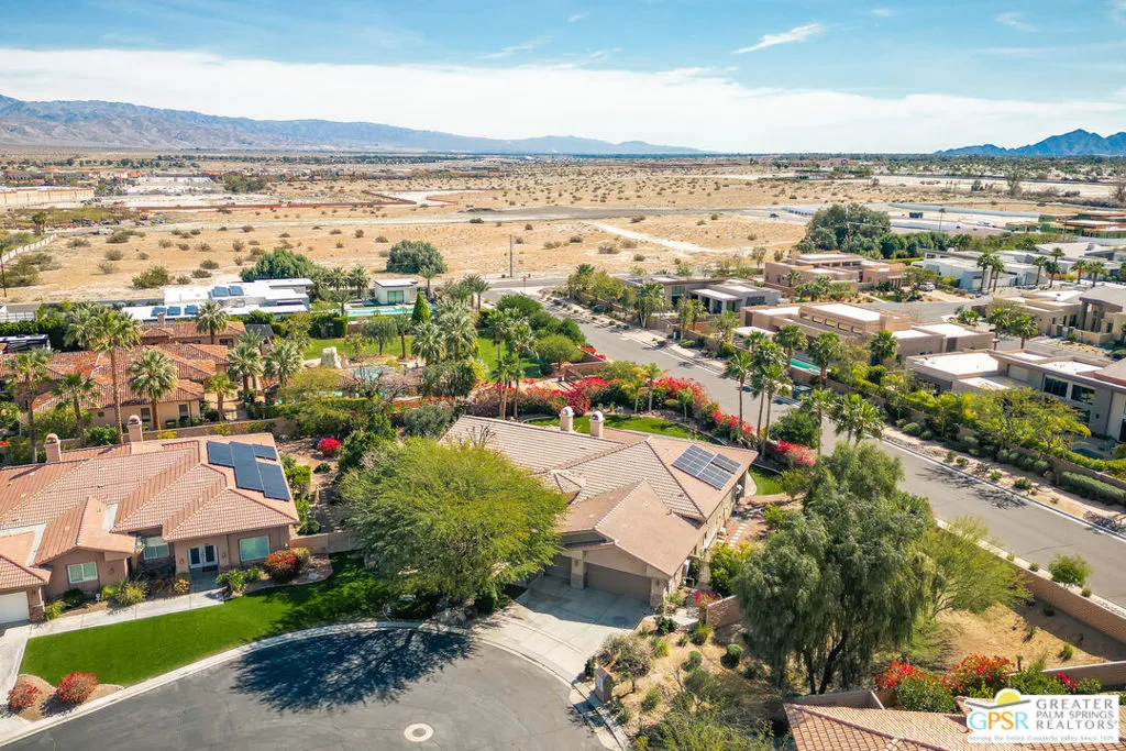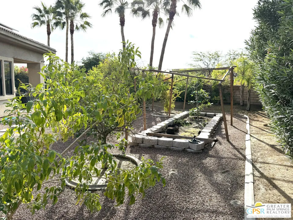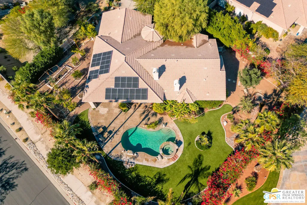 Welcome to your private escape within this contemporary Mediterranean oasis. One of just ten homes in a gated community, this professionally designed residence offers three bedrooms plus a den/office, three bathrooms, and sits on an expansive lot of over 16,000 square feet at the end of the cul-de-sac.From the moment you arrive, you are welcomed through a gated front courtyard adorned with lush landscaping and a tranquil bubbling fountain. Inside, the foyer showcases soaring ceilings and generous wall spaceideal for displaying art and treasured collections. The open living areas are both gracious and well defined, featuring a breakfast nook with bay windows, a formal dining area, and a comfortable living room anchored by a fireplace.The open kitchen is perfectly suited for both everyday living and entertaining, offering guest seating and a spacious pantry. French doors off the south-facing living area open wide to invite natural light and breezes, leading to a private lanai and BBQ, surrounded by verdant backyard complete with a custom salt water pebble tech pool and slate rock waterfall spa.The oversized lot provides ample room for a future ADU and includes a generous garden area with mature fruit treesincluding Lemon, Mexican Lime, Pomegranate, and Fig. Ideal for those with a green thumb. Back inside, the primary bedroom is a true retreat, featuring French doors that open to a seating area and a spa-inspired bath, large walk-in closet, and a fireplace. With direct access to the backyard, the suite offers seamless enjoyment of the outdoor spa on relaxing evenings.Just across the hall one will find a flexible room (listed on records as the fourth bedroom) that opens to the front courtyard and serves beautifully as an office, media room, or creative space.Continuing down the hall, you'll find a convenient powder room with nearby linen storage, along with two additional bedrooms that share a full bathroom. Additional amenities include a three-car garage, a spacious laundry room with extra storage, paid-for solar panels (installed but not connected), and a dual-zone HVAC system.This sophisticated home offers remarkable versatility ideal as a full-time residence, weekend retreat, work-from-home haven, or peaceful escape from the bustle just beyond. Conveniently located near Mission Hills Country Club and a short drive to shopping and dining, this quiet, well-maintained community offers a truly special desert lifestyle.