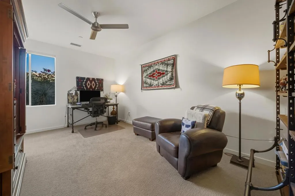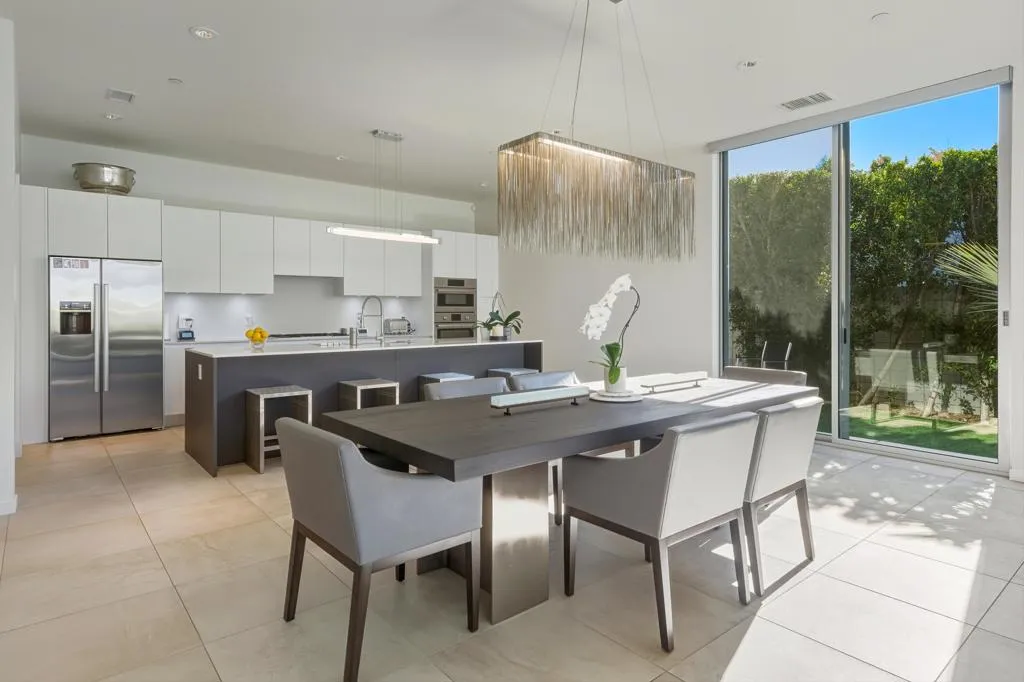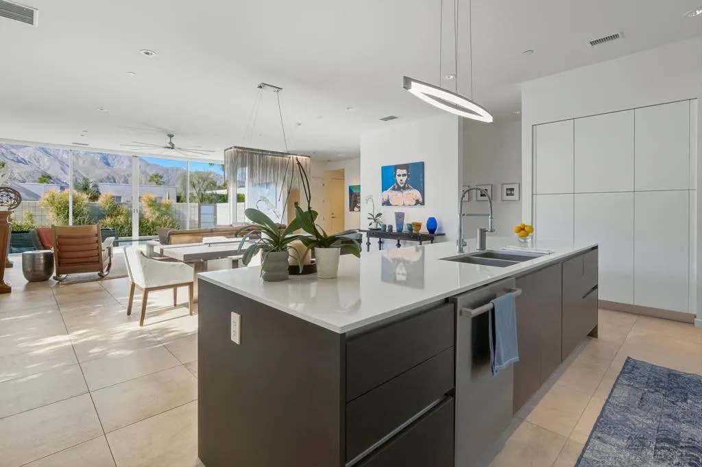 Welcome to Escena, where luxury meets contemporary elegance in this highly desired Anthony Poon designed home with AMAZING views of the San Jacinto mountains. This beautiful Alta Verde home features a wall of Fleetwood sliding doors that open to a front-loaded pool and spa, showcasing phenomenal views of the western and southern mountains. One of the larger homes in Escena, this home offers 2649 sq. ft. of luxurious living space with 3 bedrooms and 3 bathrooms. A chef's kitchen is a culinary delight with quartz countertops and backsplash, Italian designed cabinetry, stainless-steel Bosch appliances and an oversized island. The spacious open floor plan consists of the kitchen, living and dining areas, 10'+ high ceilings, porcelain tile flooring, a fireplace, custom lighting, and spectacular views. The expansive primary bedroom suite, extending the entire width of the home, has cornered Fleetwood sliding door access to a private back patio, a huge double-headed walk-in shower tucked behind dual vanities, and an extra amount of closet space, all organized by California closets. The two guest bedrooms share a Jack and Jill bathroom, with good separation from the Primary bedroom. This home offers Palm Springs indoor/outdoor living at its finest with dual sets of Fleetwood sliding doors opening from the great room to the outdoor patio and pool, perfect for entertaining or just relaxing in the sun as you revel in the unbelievable mountain views. Another Fleetwood sliding door opens from the kitchen to a lovely side yard/patio of pavers and artificial turf, perfect for relaxing or cooking on the outdoor BBQ. A blocked retaining wall spreads across the back of the property boasting lush landscaping, including beautiful bougainvillea bushes and Meyer lemon and tangerine trees. Lighting and landscaping surround the property, adding to the privacy of the outdoor space and its alluring night-time beauty. Additional highlights include motorized blinds in the great room and primary bedroom, a powder room for guests, a separate laundry room with cabinetry, 2-car garage, upgraded recessed lighting and 26 solar panels for energy efficiency. Escena is a highly sought after guard-gated golf course community with low HOA dues and resides on fee simple land (you own it). Do not miss this beautiful Palm Springs contemporary home, offering luxury, unparalleled comfort, style, and some of the best views in Escena!