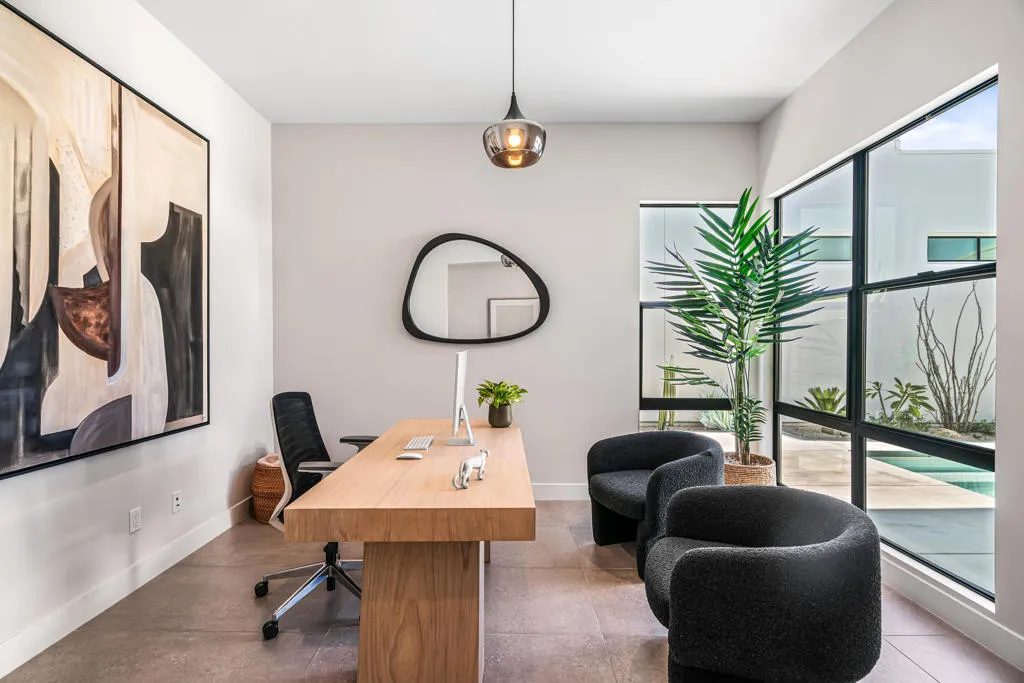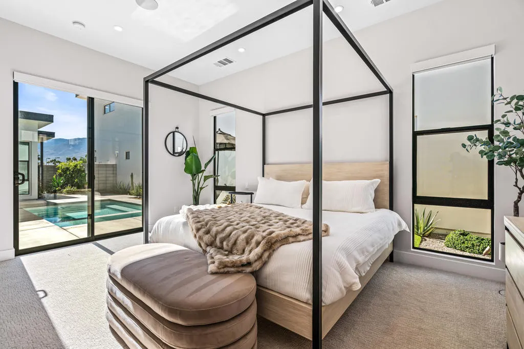 Welcome to your own modern oasis at The Vue, perfectly situated in the heart of Palm Springs. This award-winning, single-story home offers approximately 1890 sq ft of warm, inviting living space with a thoughtful organic modern design throughout. With 2 spacious bedrooms, 2.5 bathrooms + office/den, the layout is both refined and functional, enhanced by high ceilings and abundant natural light from multiple clerestory windows. The kitchen is beautifully appointed with Thermador appliances and gorgeous wood cabinetry, and it flows effortlessly into the main living area--ideal for entertaining or everyday comfort. Enjoy upgrades including an owned solar system, built-in media center, Sonos sound system, electric blinds, and ceiling fans throughout. The primary suite is a true retreat, featuring a spa-like bath with dual vanity, an oversized shower, and a generous walk-in closet. Step outside through dual multi-slide doors to a private backyard oasis with south-facing mountain views, a pool and jacuzzi, and a large covered patio perfect for outdoor dining and lounging. Just minutes from Palm Springs' best shopping and restaurants, this home delivers the perfect blend of style, comfort, and location.