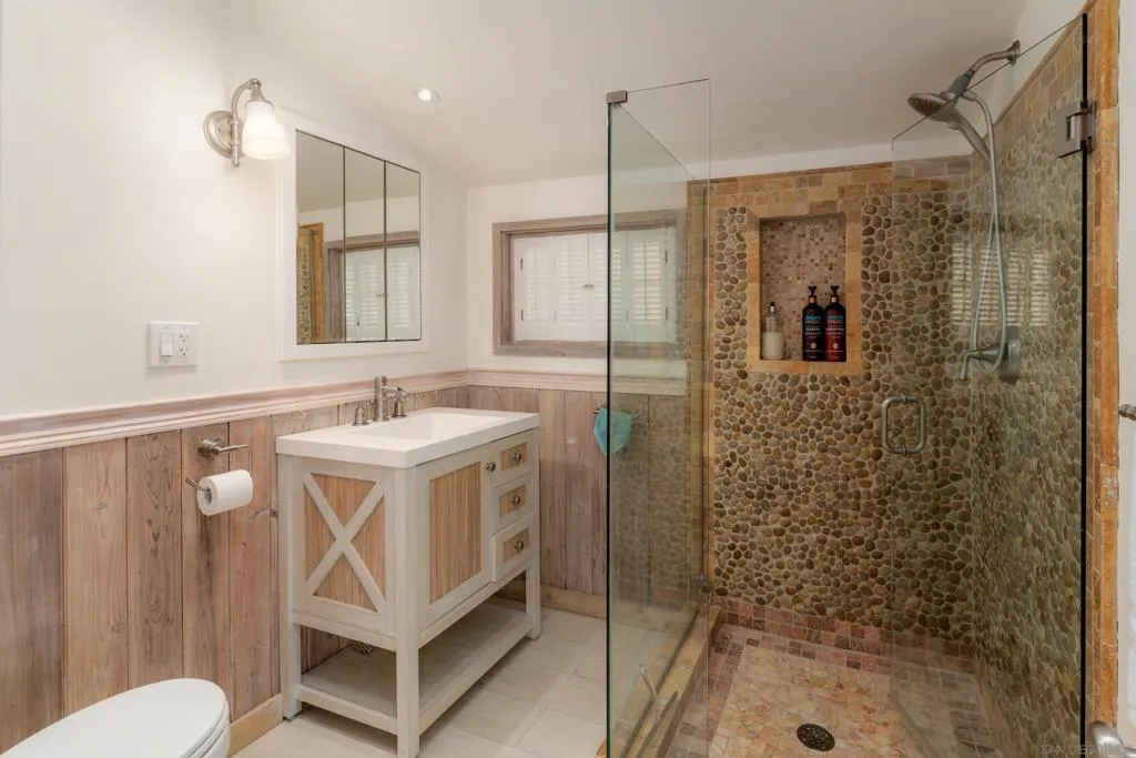 Variance granted Detached. Welcome to 383 Westbourne St. - an incredibly rare offering in the coveted Beach Barber Tract of La Jolla, just one block from Windansea Beach. This exceptional coastal residence seamlessly blends refined California beach living with modern luxury, set on an expansive double lot - a rarity in one of La Jolla's most in-demand neighborhoods. The property has undergone a full, comprehensive, thoughtful remodel: including full exterior siding replacement, owned solar, and a complete interior transformation featuring high-end finishes, designer lighting, and top-of-the-line appliances throughout. Every detail of this home has been curated with both elegance and livability in mind. The estate includes a main residence, 1 bed / 1 bath detached guest house with full kitchen, and two-car garage, offering flexibility for guests, extended family, or additional income potential. Outdoor living is exceptional, with generous front and backyard spaces designed for both relaxation and entertaining. Enjoy a built-in grill, above ground spa, custom putting green, and multiple lounge and entertaining areas - all surrounded by lush, mature landscaping and a fully fenced, private yard- your own serene coastal oasis. Whether you're savoring quiet moments at home or taking a short stroll to catch a surf session or sunset, this property delivers the quintessential La Jolla lifestyle. Located in the prestigious Beach Barber Tract, known for its proximity to the ocean, walkability, and timeless appeal, this is truly one of the finest coastal settings in San Diego. Zoned RM-1-1, the property offers future flexibility and development potential, making it equally compelling as a primary residence, second beach home, or long-term investment opportunity. Rarely does a home of this caliber, condition, and location become available. 383 Westbourne Street is a one-of-a-kind, turnkey, coastal retreat- meticulously updated, impeccably maintained, and perfectly positioned in one of La Jolla's most iconic neighborhoods.