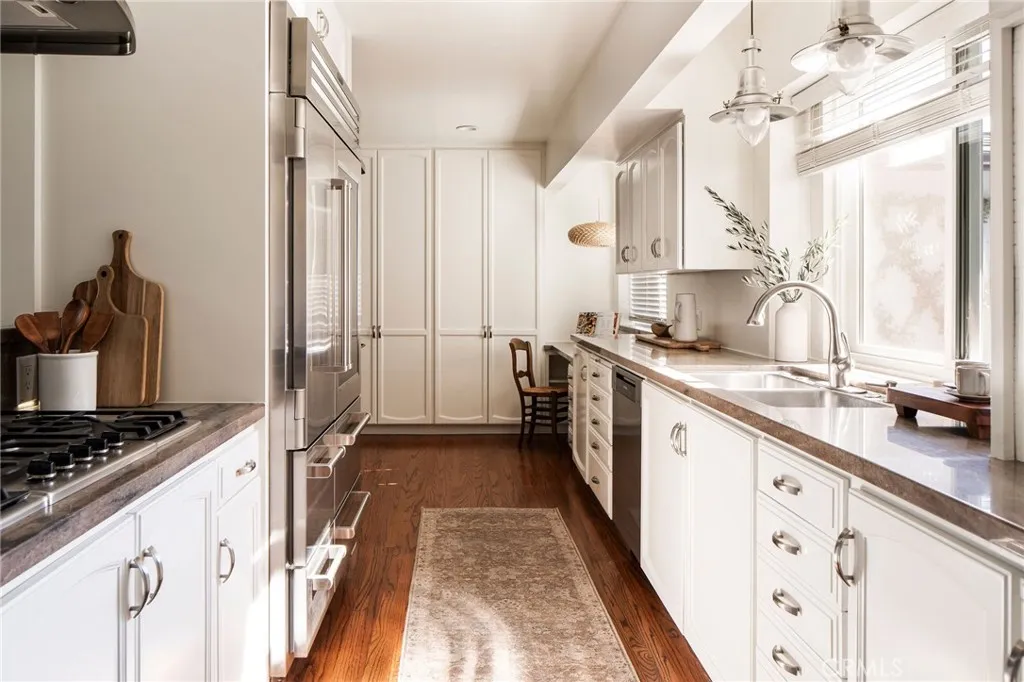 The kitchen has been designed with longevity and functionality in mind, featuring a Miele dishwasher, a Sub-Zero refrigerator, Bosch double ovens, a built-in coffee station, and a breakfast nook complemented by a wet bar and beverage refrigerator. Bathrooms have been updated with stone surfaces and pedestal tubs, maintaining a restrained material palette that respects the home’s original character while providing modern comfort.
