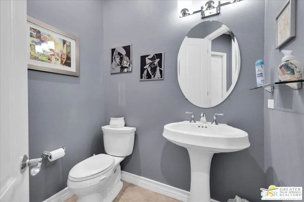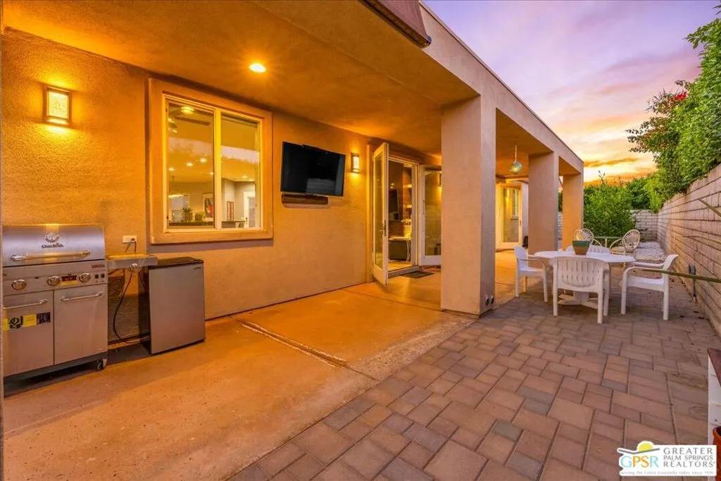 Elegant Cul-de-Sac Retreat with Pool, Spa & Mountain Views! Tucked away on a quiet cul-de-sac in the heart of Palm Desert, this expansive three-bedroom, two-and-a-half-bath residence offers refined desert living with breathtaking mountain views, generous entertaining spaces, and seamless indoor-outdoor flow. Inside, the home is beautifully appointed with 14" tile flooring, luxury vinyl plank in select areas, cellular window treatments, and upgraded LED lighting throughout. The expansive open kitchen is designed for both everyday living and entertaining, featuring granite countertops, tile backsplash, high-end stainless steel appliances, a wet bar with wine fridge, and a breakfast bar with ample seating. The great room is warm and inviting, anchored by a tiled gas fireplace with custom built-in cabinetry and shelving - perfect for housing audiovisual equipment and enhanced by built-in rear-channel speakers. Adjacent to the living area, a versatile flex space currently serves as a game room but easily transitions into a formal dining or additional seating area, all while capturing stunning mountain views. An informal dining area just off the breakfast bar features glass French doors that open to an expansive side yard with custom tiered hardscape and artificial turf, creating a tranquil setting framed by the surrounding mountains. The primary suite is a true retreat, offering updated vinyl plank flooring, recessed LED lighting, a stylish fandelier, and glass French doors with invisible screens that open directly to the lanai - perfect for enjoying the desert lifestyle year-round. The spa-inspired ensuite bath features dual sinks with stone countertops, a glass-enclosed shower with bench, a jetted soaking tub, and a spacious walk-in closet. Two additional bedrooms are generously sized and filled with natural light, sharing a well-appointed pass-through bathroom with dual sinks and a shower/tub combination. Outdoors, the property truly shines. The expansive lanai and extended patio create multiple areas for relaxing and entertaining, while the yard wraps around to the front of the home where a sparkling pool and spa await - set against dramatic mountain views that define desert living at its finest. Additional highlights include leased solar ($282 mo), a large laundry room, newer HVAC system, and an oversized, insulated, climate-controlled 2.5-car garage with epoxy-sealed floors and a 240v outlet for an EV charger. Ideally located near Albertsons and Bristol Farms shopping centers, this home offers convenient access to grocery stores, dining, and everyday amenities. This is a rare opportunity to enjoy space, comfort, and stunning scenery in a prime Palm Desert location.