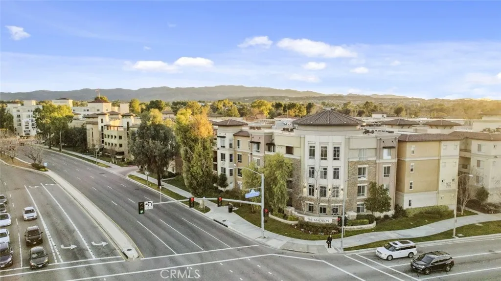 An exquisite and fully furnished condo with in-unit laundry, right across from major shopping centers and a variety of entertainment, residing within the prestigious Madison of Santa Clarita! Completely illuminated by both large windows and recessed lighting throughout, find a 1,090-sqft floorplan detailed with beautiful laminate and stone flooring, tons of built-in storage space, and a fabulous private balcony enjoying scenic views of the courtyard below. The lovely open concept allows for seamless entertaining between the dining and living spaces, and even includes a built-in office nook with shelving and extra lighting. Sparkling stone countertops and well-crafter shaker cabinets adorn this user-friendly kitchen equipped with built-in stainless-steel appliances while also including a comfortable breakfast bar with two pendant lights overhead. Both bedrooms are calming spaces featuring built-in closets with one bedroom including a dual entry bathroom. The large primary bedroom enjoys the exclusive benefit of separate access out to the balcony plus an en-suite bathroom fitted with a corner double sink vanity. The perfect place to call home with this sought-after community offering of a beautiful courtyard, fitness center/gym, lounge areas, recreation space, dining areas, shaded outdoor picnic areas, and the glittering waters of the sun washed pool plus spa provided to all residents. Right in the heart of beautiful Santa Clarita and nearby the Valencia Westfield Mall, a variety of shops, restaurants, entertainment, markets, plus city transportation, and easy access to the 5 freeway!