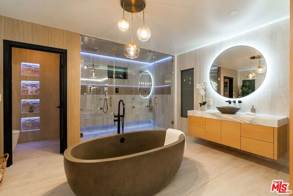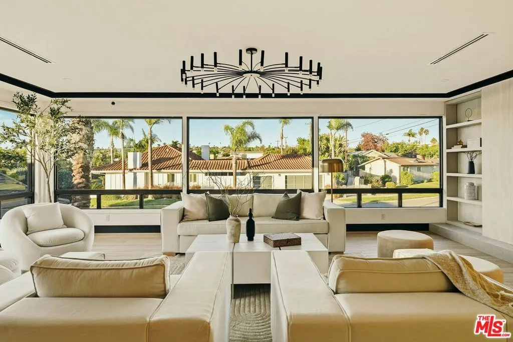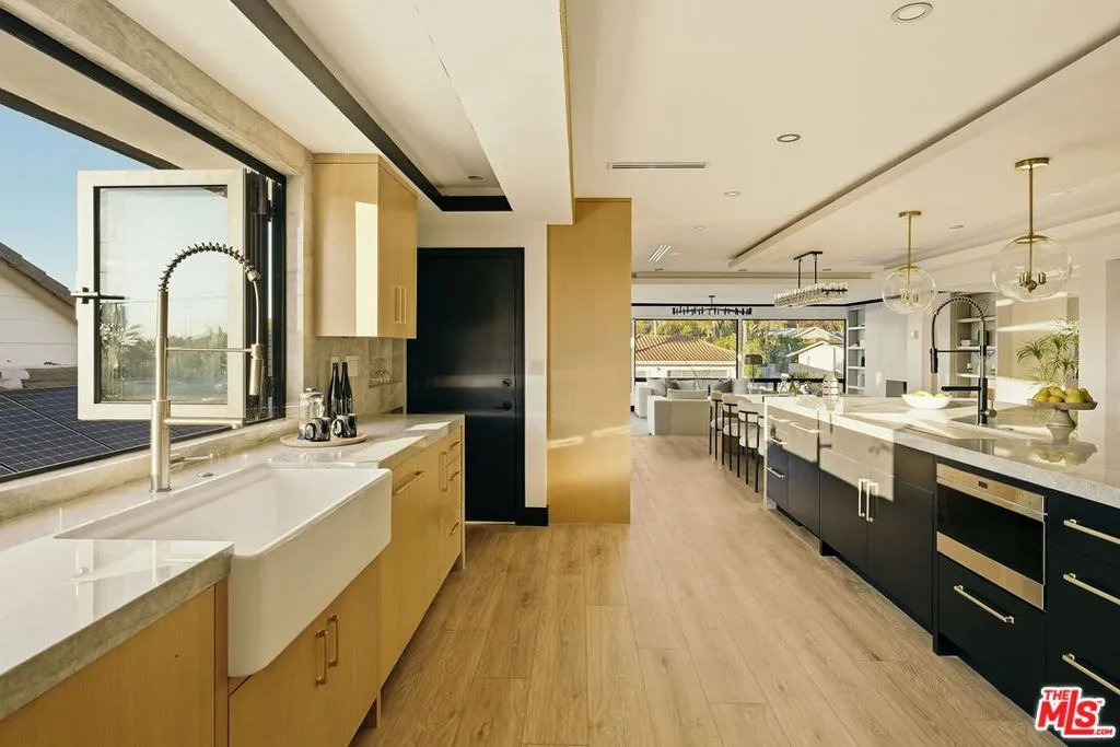 Welcome to this stunning contemporary home in the desirable Ladera Heights neighborhood, where modern elegance meets exceptional functionality. As you walk in through the impressive pivot front door, you are greeted by a sophisticated foyer featuring a wine glass enclosed display and a beautifully designed cove ceiling entry that sets the tone for the rest of the home. The inviting open floor plan seamlessly integrates the family room, which impresses with a state-of-the-art 100-inch TV and a cozy electric fireplace, while the living room features built-in bookshelves and expansive window walls that showcase breathtaking views of city lights and treetops, offering a perfect space for both relaxation and entertainment. Adjacent to the kitchen is a dedicated dining room, thoughtfully designed to accommodate gatherings with seating for eight at the dining table and four at the island counter top. The gourmet kitchen itself is a chef's dream, boasting an over sized island with Taj Mahal stone counter tops and a waterfall edge, complemented by custom cabinets and high-end Thermador appliances including a built-in refrigerator, freezer, wine cooler, and a Wolf 48-inch stove equipped with a pot filler overhead. Additional culinary conveniences include two ovens, a speed oven, two Bosch dishwashers, and a built-in coffee maker for your daily lattes. An accordion window perched above the farmhouse sink adds a unique touch, seamlessly connecting the indoor space to the outdoors, while three additional accordion doors throughout the home invite in natural light and fresh air. The primary bedroom suite serves as a personal sanctuary, complete with a lavish walk-in closet featuring built-in storage, an island, and chandelier, along with a stunning double shower that includes body sprays and a steam feature. Step outside to discover the outdoor space, truly an entertainer's paradise, featuring a spacious deck off the living room and primary bedroom, along with a fully equipped outdoor kitchen that boasts an eat-in bar accommodating approximately 10 or more people, topped with beautiful black onyx granite and a waterfall edge. This space also includes a built-in BBQ, sink, mini refrigerator, and TV, as well as a projector with an impressive 18 to 20-foot wall screen for movie nights. The over sized pool with a dramatic waterfall and beautifully landscaped grounds with palm trees and artificial grass complete this incredible outdoor oasis. This exceptional property also boasts all new electrical, plumbing, and roofing, as well as a new HVAC system with two separate Google thermostats for optimal climate control. Speakers throughout the primary bedroom and powder room enhance your living experience, making this home perfect for modern living. With a 3 car garage equipped with new doors and an EV charger, and conveniently located near shopping options like Trader Joe's, Sprouts, and Amazon Fresh, as well as just minutes from the beaches and LAX, this home offers an unparalleled lifestyle of luxury and convenience.