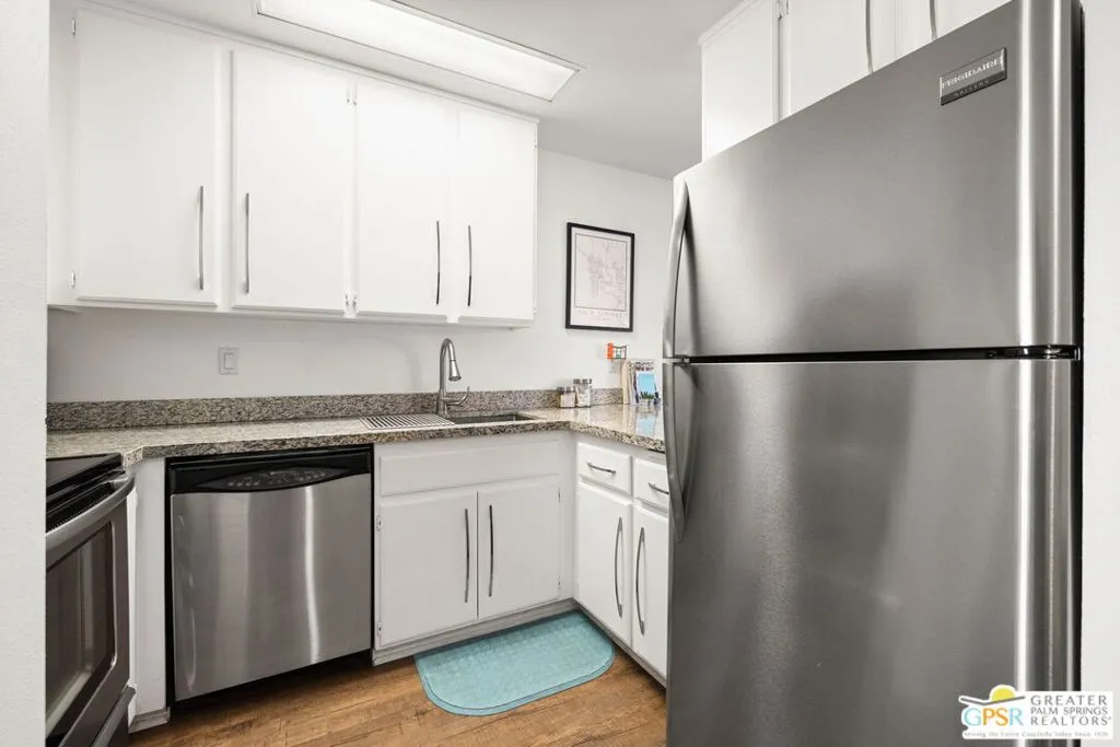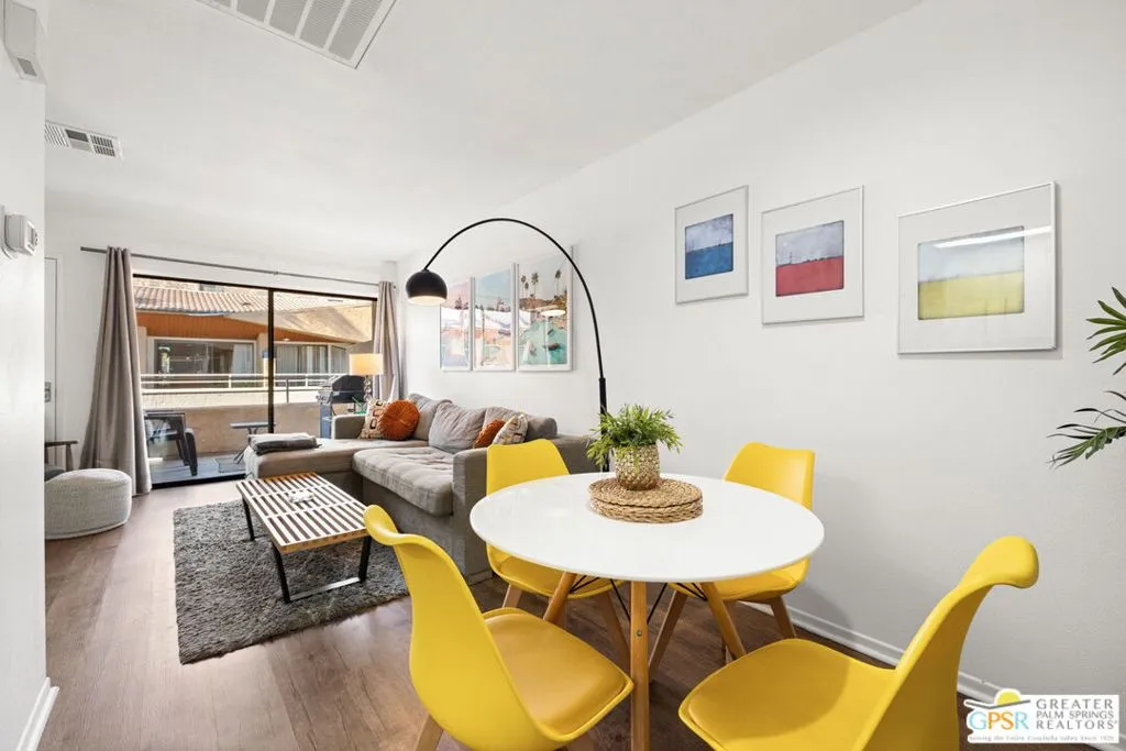 SUCCESSFUL SHORT TERM VACATION RENTAL just blocks from downtown Palm Springs dining, shopping, and entertainment. Located within the gated Biarritz community, this top floor 1 bedroom, 1 bath residence is offered turnkey furnished and is already proven as an income producing property. Ideal as a short term rental, longer term investment, weekend retreat, or full time residence. Dual balconies deliver a mix of pool and mountain views, adding strong guest appeal and indoor outdoor living. The open living, dining, and kitchen layout with pass through design maximizes usability and rental functionality. The spacious ensuite primary bath has been tastefully updated. Biarritz amenities include a large swimming pool, two spas, two tennis courts, secured bike storage, laundry rooms, and assigned covered parking. Prime location moments from the core of downtown Palm Springs, a consistent driver of rental demand. Low HOA fee supports strong net potential. Land Lease is currently $126.63/mo and expires in 2046.