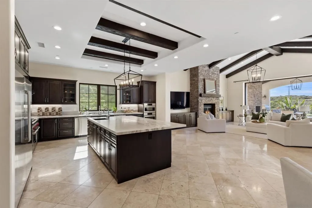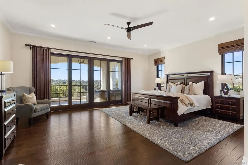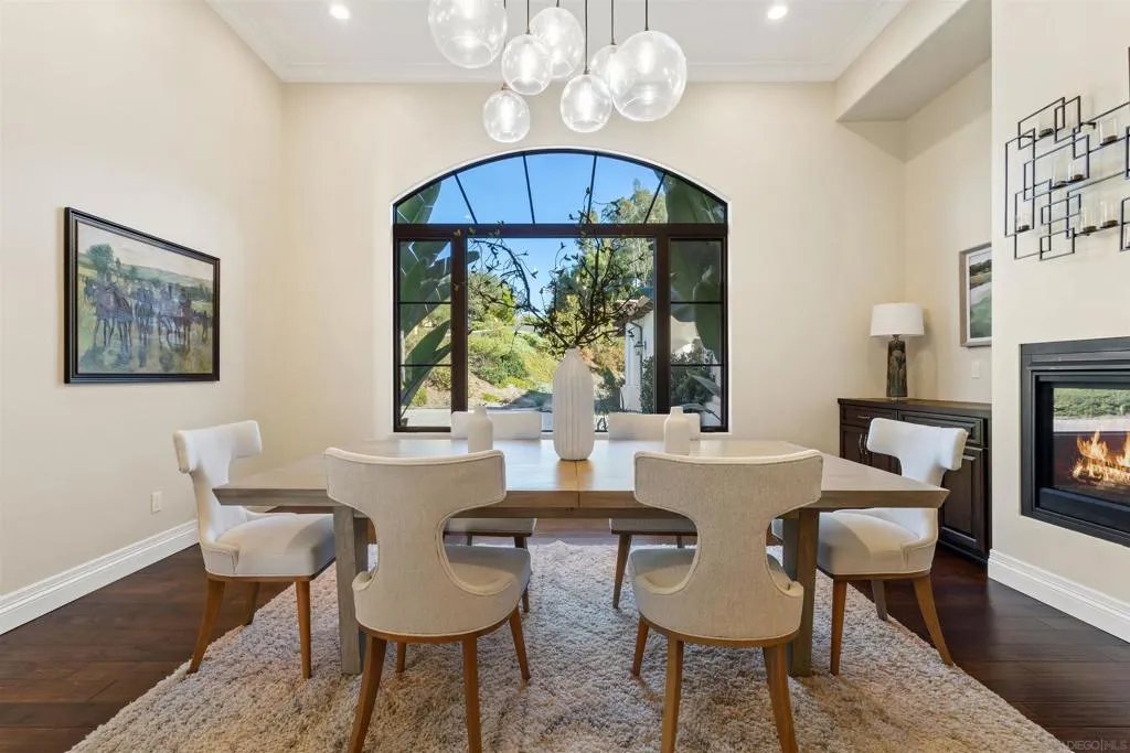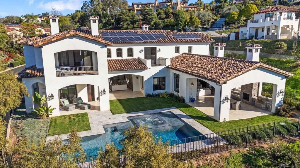 Absolutely stunning custom estate completed in 2022—among the newest homes in the prestigious Crosby at Rancho Santa Fe. Ideally located on a quiet, beautifully curated street of luxury residences within the highly rated Solana Santa Fe (K–8) and Torrey Pines High School districts, and near top private academies. Designed by local architect Scott Grunst, this 6,523 sq. ft. residence blends timeless elegance with modern luxury. A dramatic 22-foot foyer sets the tone with soaring arched windows, hardwood floors, exposed solid wood beams, and a grand staircase with wrought-iron railings. The chef’s kitchen is equipped with an eight-burner Wolf range with infrared charbroiler, 64" Electrolux refrigerator/freezer, double Electrolux dishwashers, custom stained alder cabinetry, and Brazilian quartzite countertops. Entertain effortlessly with a full wet bar featuring a built-in kegerator and a custom, climate-controlled 800-bottle wine cellar with additional storage. Disappearing pocket doors create seamless indoor-outdoor living, opening the main living space to a covered loggia with fireplace, full outdoor kitchen, and Wolf BBQ. The resort-style backyard offers exceptional privacy with no close neighbors and showcases a rim-flow PebbleTec® pool, vanishing-edge spa, raised fire pits, and unobstructed sunset views over a protected natural preserve. The thoughtful floor plan includes an elegant executive office on the main level with built-ins and fireplace, a main-level guest or secondary primary suite ideal for multigenerational living, and a spacious upstairs primary retreat. Upstairs also features two additional ensuite bedrooms and a game room overlooking the living room below. Additional highlights include an owned solar system, oversized motor court, and a four-car garage configuration: attached two-car garage with Tesla charger plus a detached, insulated two-car garage with A/C wiring—ideal for a gym, studio, or yoga space. Residents enjoy access to The Crosby’s Fred Couples-designed golf course, 35,000-sq.-ft. clubhouse, tennis and pickleball courts, Olympic-size pool, spa, fitness center, dining, and active social calendar. Conveniently located with quick access to Rancho Santa Fe Village via the north gate and Hwy 56, Hwy 15, and Hwy 5 via the south gate for beaches, shopping, and dining.