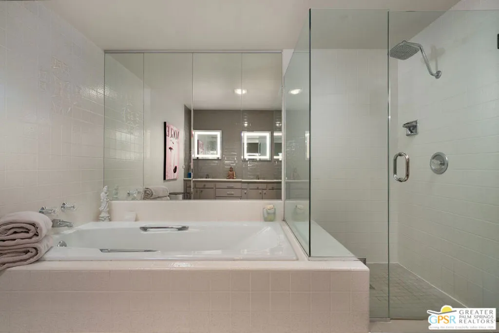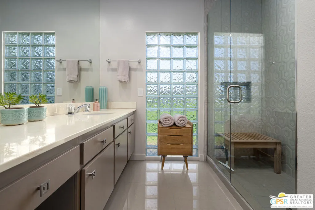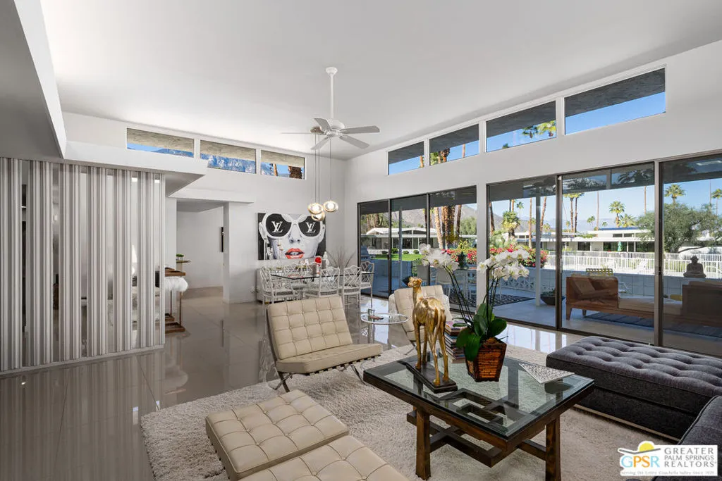 In the heart of South Palm Springs' celebrated Canyon Estates, this Charles Du Bois designed residence stands apart for its rare scale, setting, and Fee Land location. Tucked at the end of a peaceful Cul-De-Sac, the home's north-facing orientation delivers breathtaking, unobstructed views of the San Jacinto Mountains, best enjoyed from what is widely considered one of the largest private patios in Canyon Estates. The architecture is unmistakably desert modern: crisp lines, clerestory windows, and expansive glass walls that dissolve the boundary between indoors and out. Designed for both entertaining and everyday living, the home features two generous bedroom suites and a third bedroom, currently appointed as a refined den or private office, offering exceptional flexibility for modern lifestyles. The open-concept living area flows effortlessly from lounge to dining to a sophisticated wet bar, all opening directly to the patio - an ideal backdrop for hosting or quiet evenings under the mountains. The kitchen remains true to the original architectural vision while connecting seamlessly to outdoor dining. Residents of Canyon Estates enjoy a resort lifestyle with a nine-hole executive golf course, 15 pools, 12 spas, tennis courts, clubhouse, and fitness center. Minutes from Indian Canyons hiking, Andreas Hills, and downtown Palm Springs, this home offers a rare opportunity to own an architecturally significant residence.