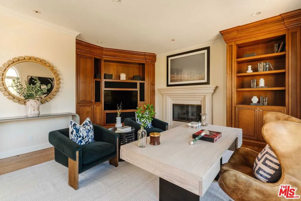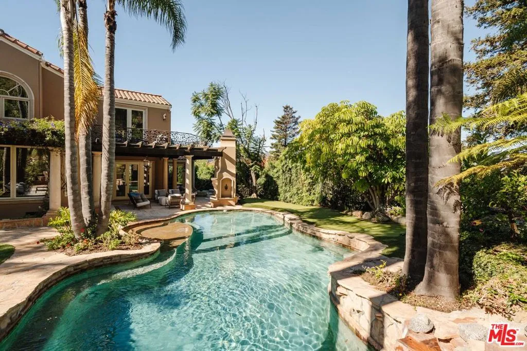 Nestled on a coveted street in the Palisades Highlands, this private residence blends timeless design, thoughtful expansion, and one of the neighborhood's most exceptional backyards - all on over three quarters of an acre. Guests are welcomed beneath a grand two-story foyer, flanked by a stately formal living room with a fireplace set beneath vaulted, beamed ceilings. Beyond the spacious family room, the chef's kitchen features dual islands, top-of-the-line appliances and an informal dining area overlooking the serene landscape - opening seamlessly to the backyard. Down the hall, find a large formal dining room, study/office, and a media room with an ensuite bath that can serve equally well as a theater or secondary downstairs guest room. Completing this level are the laundry room, guest room, and direct garage access. Upstairs, discover three bedroom suites, including a stunning primary wing. This expansive retreat offers a large bedroom under vaulted ceilings with backyard views from a private balcony, two walk-in closets, and a luxurious bath with dual vanities, a soaking tub, and an oversized steam shower. One of the guest suites includes its own den/play area that could easily double as a fourth upstairs bedroom or secondary office. The resort-like backyard is a true highlight, showcasing a custom pool and spa, waterfall, putting green, heated loggia with fireplace for dining or lounging, manicured landscaping, BBQ area, and a private walking trail leading to multiple view decks. Residents enjoy access to incredible hiking trails as well as the Highlands recreation center with tennis courts and a forthcoming clubhouse with pool. With its welcoming atmosphere and strong sense of community, the Highlands continues to thrive - especially on this street, where most homes remained untouched by the fire.