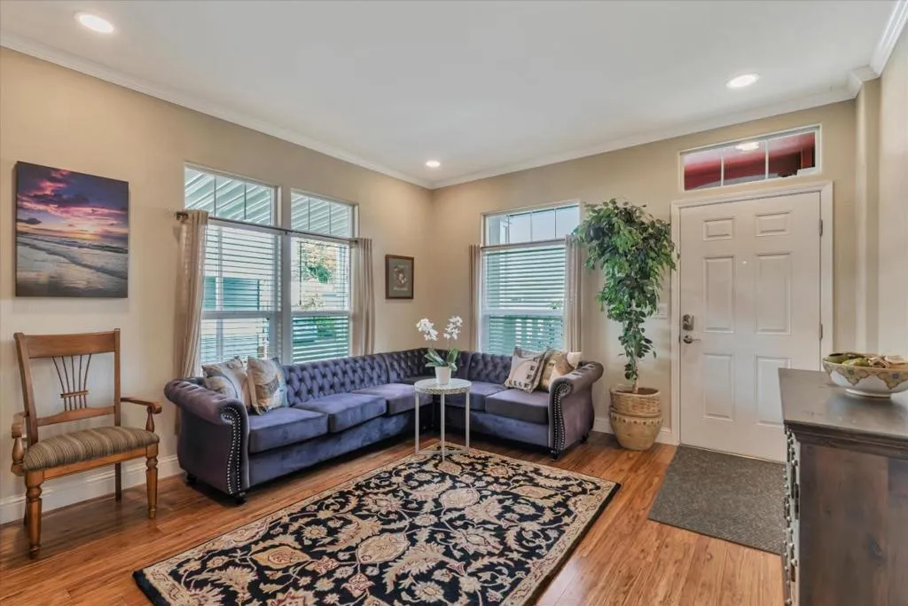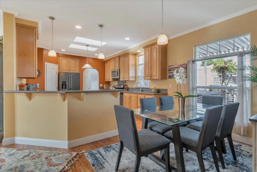 Forget everything you thought you knew about manufactured homes. This extra-large, custom-designed home immediately sets itself apart with generous square footage and thoughtfully chosen, high-quality finishes throughout. Flooded with natural light from skylights and vaulted ceilings, the interior feels open and airy. The chefs kitchen features high-end appliances, a large island, and beautiful granite and marble counters. Built-in bookshelves, woodgrain laminate flooring, and a fireplace add warmth and character. Sliding glass doors open to a lush, private garden. The front portion of the home includes two bedrooms, a custom bath, a separate living room, and two private entrances. An ideal set-up for extended household living or guests. Toward the rear, a spacious living room with fireplace, separate dining area, a wall of windows, and an expansive kitchen anchor the main living area. The primary suite features a walk-in closet and a luxurious bath with spa tub. Every inch reflects quality construction. Reports are clean.The home has been meticulously cared for. Alimur Park is a well-managed, resident-owned co-op community with a pool and charming clubhouse. All within walking distance to downtown Soquel, Capitola Village and Wharf, nearby beaches, and 41st Avenue shopping.
