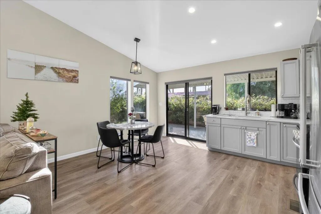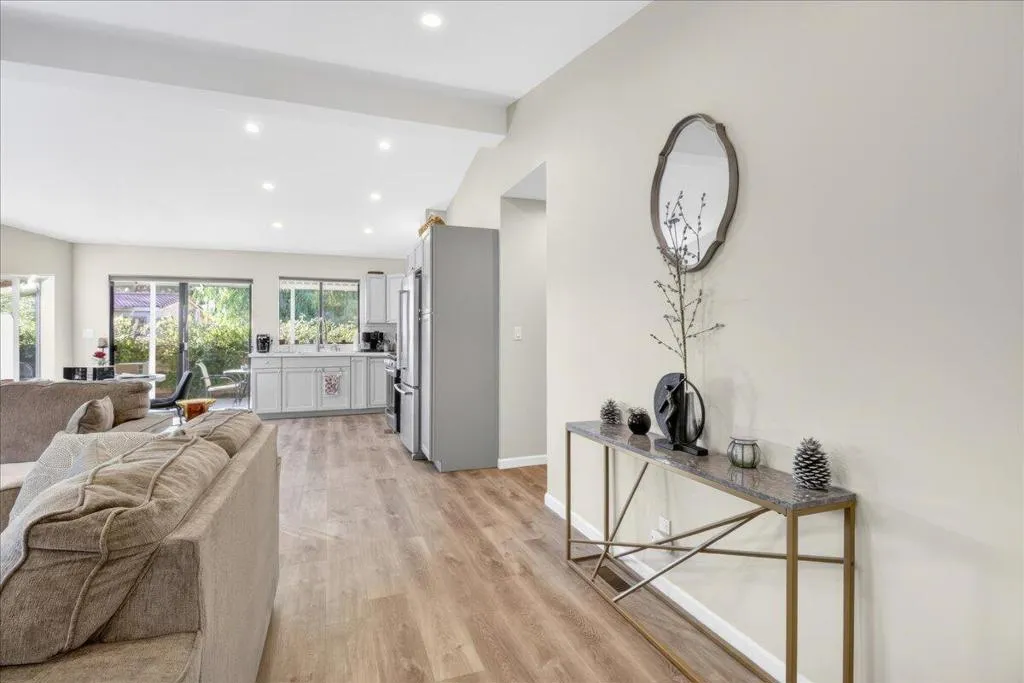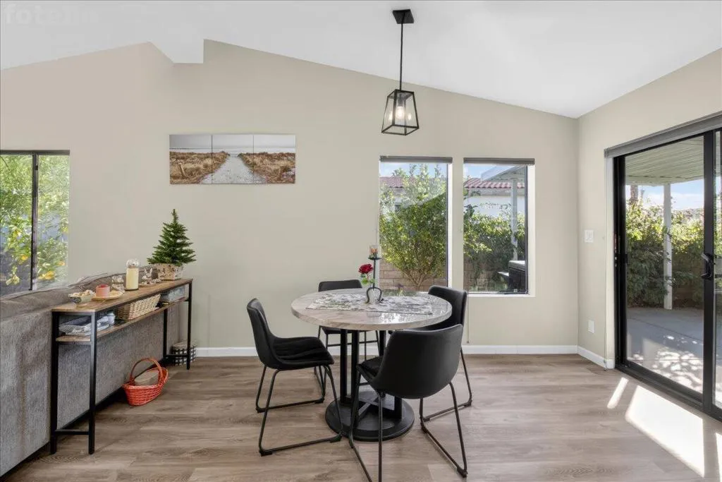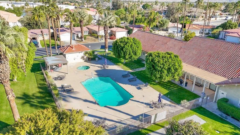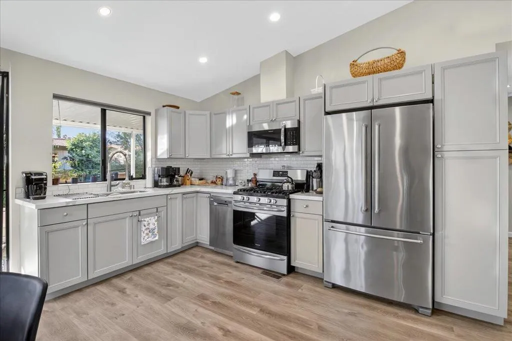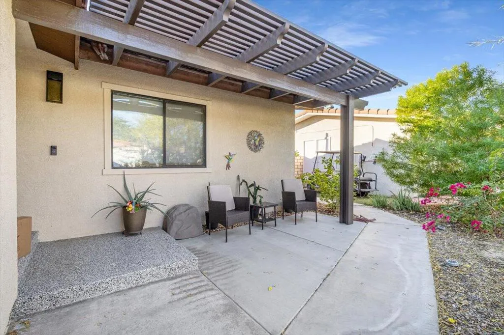 Beautiful remodel in 2021 in the Palm Desert gated community of Golden Sun Estates. Kitchen includes newer appliances, quartz countertops, open floor plan with vaulted ceilings. Newer doors and windows, recessed lighting and custom window treatments. Oversized primary bedroom and bath with dual sink vanities and updated tile showers in both bathrooms. Two-car attached garage with new epoxy floor. Covered patio, greenbelt that offers extra space between properties in the back yard. Mountain views from the patio, South facing exposure, low maintenance yard with citrus trees. Golden Sun Estates offers tennis court, community pool and spa, greenspace and pet friendly. The home is located close to shopping centers, restaurants and stores. Low HOA dues and well-maintained common areas.