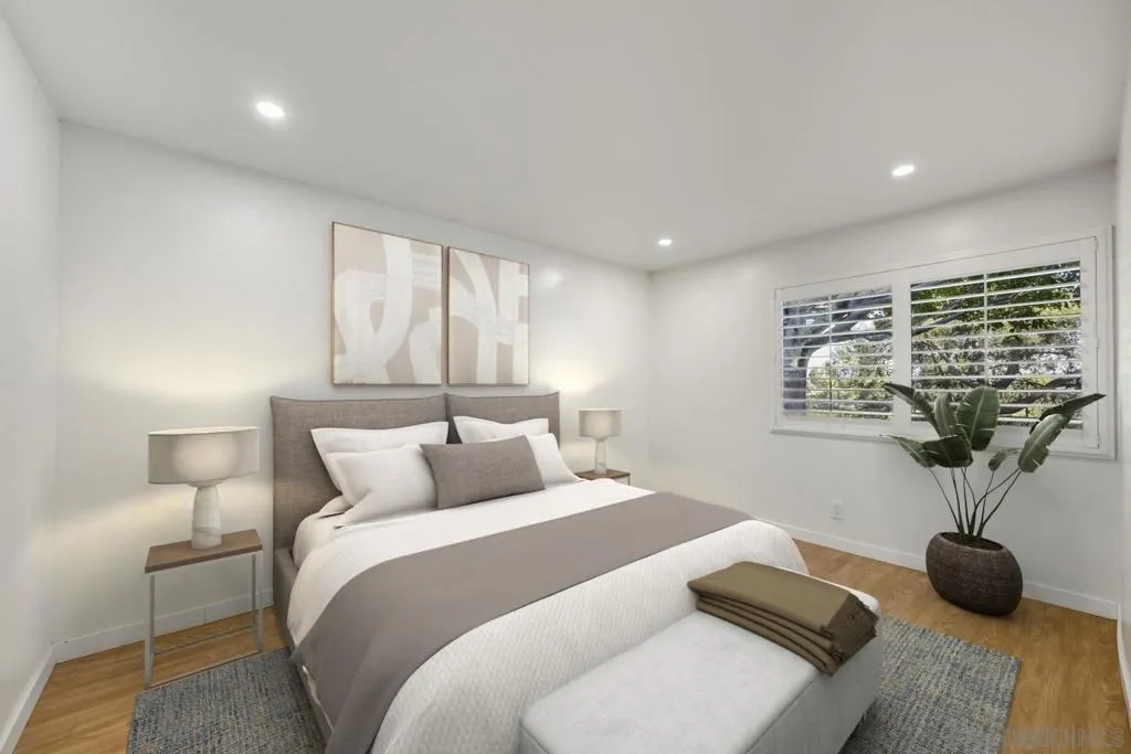 Enjoy effortless single-level, entry-level living in this beautifully updated La Jolla residence with no stairs, ideally located just blocks from premier shopping, dining, and a nearby park. Sleek quartz countertops and crisp white cabinetry throughout create a bright, modern aesthetic, complemented by luxury vinyl plank flooring for a clean, cohesive look. Elegant plantation shutters add timeless charm, while the oversized walk-in closet—spacious enough to serve as a home office, dressing room, or private retreat—offers exceptional versatility. A full-size washer and dryer add everyday convenience. With its highly desirable central location and easy, stair-free access, this home delivers comfort, style, and walkable La Jolla living at its best.