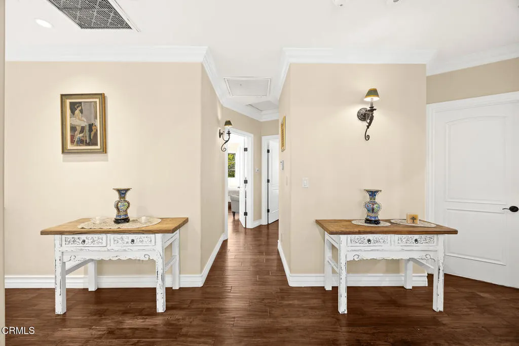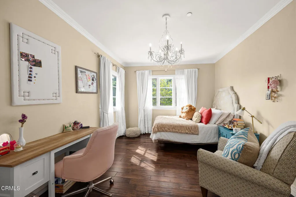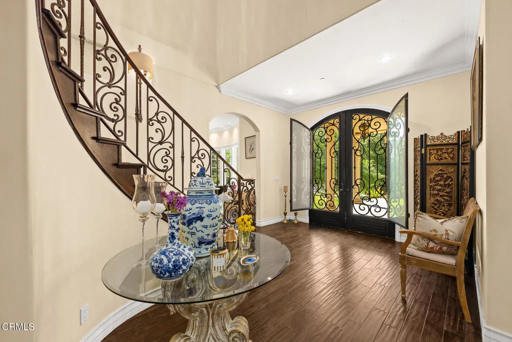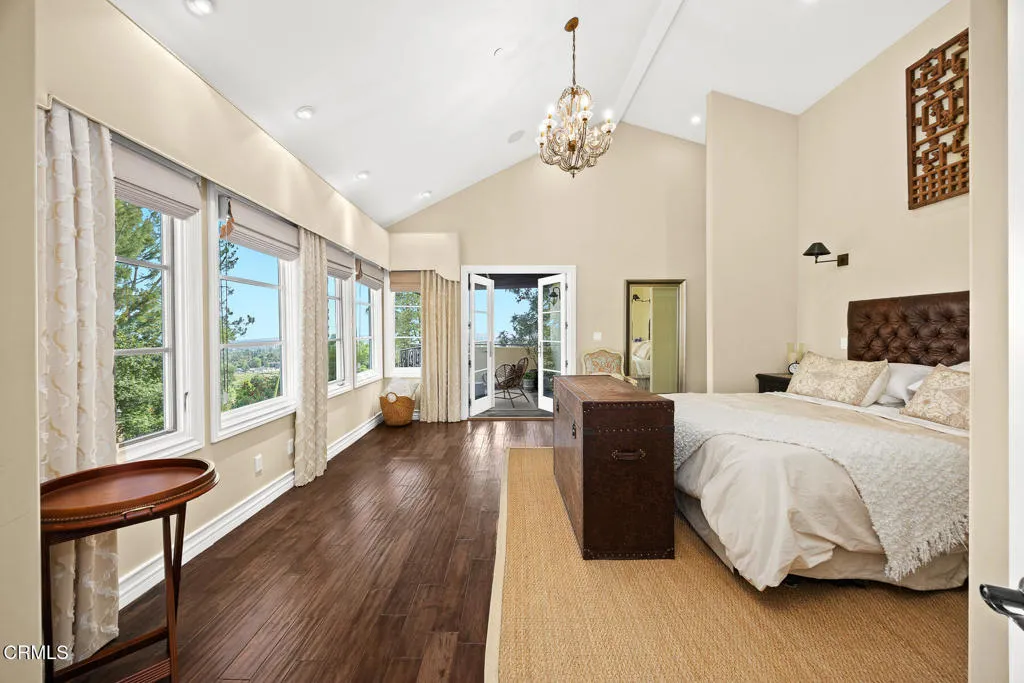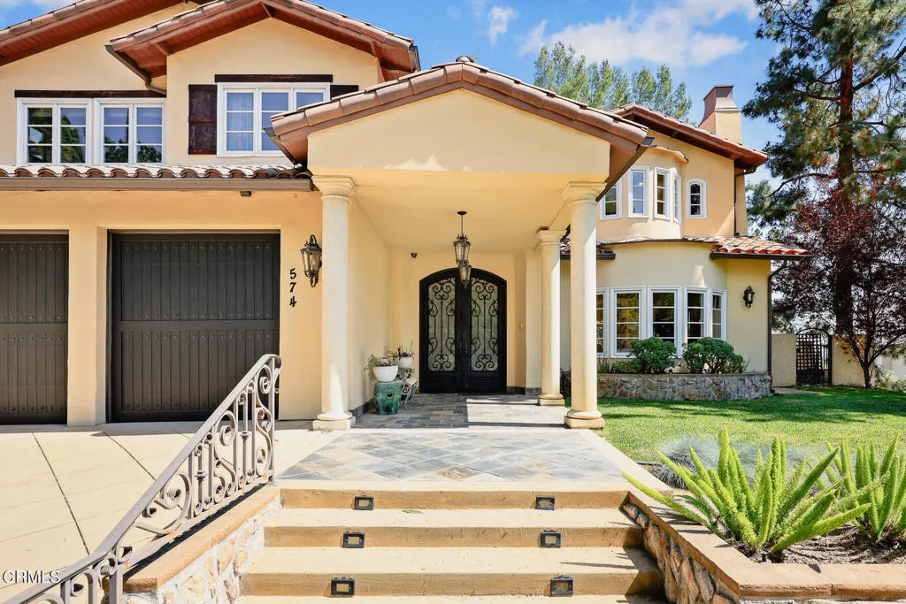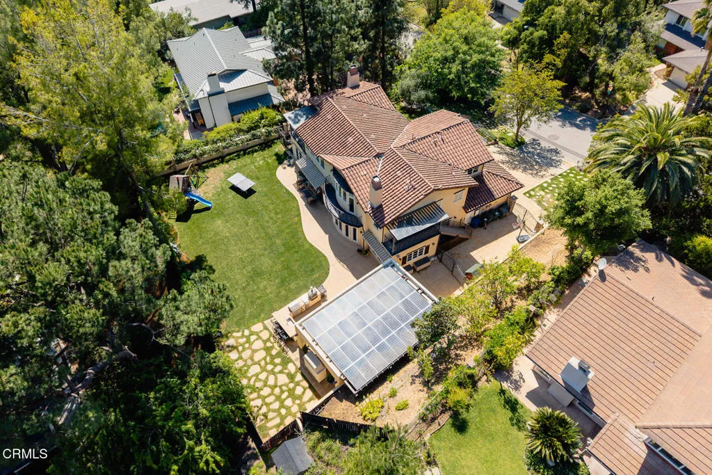 Welcome to this magnificent Mediterranean-style custom estate -- a rare gem nestled in the heart of Sierra Madre.As you enter through the impressive 8.5ft custom iron and glass double doors, you're greeted by a high-ceilinged entryway. The foyer leads into the heart of the main level: a chef's dream kitchen with an 8-burner Viking stove, built-in refrigerator and Sub-Zero wine cooler.Open to the eat-in kitchen is the living room, complete with a wood-burning fireplace and bespoke built-in cabinetry for television and immersive sound AV components.The formal living room features a second wood-burning fireplace with a distinctive marble mantle. This elegant space flows into the formal dining room. The high ceilings throughout contribute to the grand and airy feel.The first floor also includes a guest suite, a powder room, and a versatile bonus room.Ascend the grand, curved staircase to the home's upper level. There, you're welcomed by a stunning custom library with vaulted and beamed ceilings with two built-in Spanish-style desks. The curved balcony just outside the library offers sweeping views of city lights, treetops, and mountains.The primary suite - also with vaulted ceilings - serves as a retreat, featuring a walk-in dressing room with double doors leading to an en-suite bath. The primary bath boasts a Kohler jetted tub, a large rain shower, and a Toto Washlet. The suite also opens to a private balcony.Upstairs you'll also find a private home gym, complete with yet another balcony. Two additional bedrooms with walk-in closets, a full bathroom with double vanities, and a generous laundry room complete the upper level.The park-like backyard is an entertainer's dream. The outdoor space features a full outdoor kitchen with a Twin Eagles gas grill, and a Fornetto wood-burning pizza oven. A gas fireplace sits beneath a canopy with 36 solar panels, which help power the home and charge the two Tesla backup batteries.The terraced side yard is lined with several types of fruit-bearing trees, while the opposite side yard contains a boxed herb garden.Additional highlights include 2 HVAC units, 2 tankless water heaters, 2 LifeSource whole-house water filtration systems, 2 220 EV charging outlets located in the 3-car garage, recreational vehicle parking, 6 cam CCTV system, central vacuum and a multi-zone Sonos sound system.Don't miss this rare opportunity to own a truly one-of-a-kind estate in beautiful Sierra Madre.