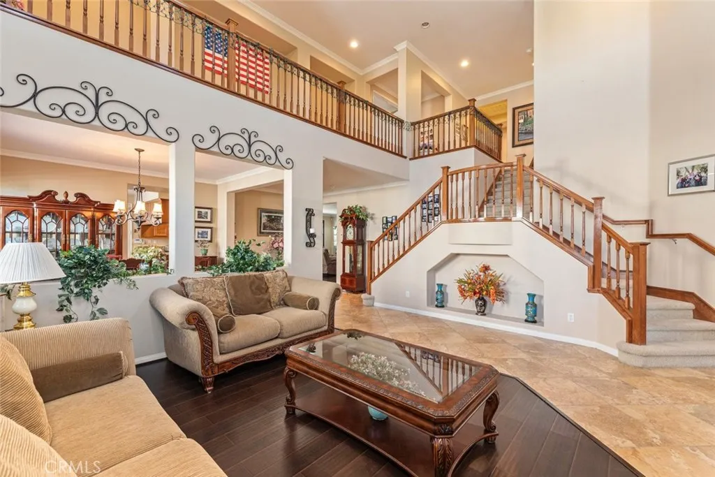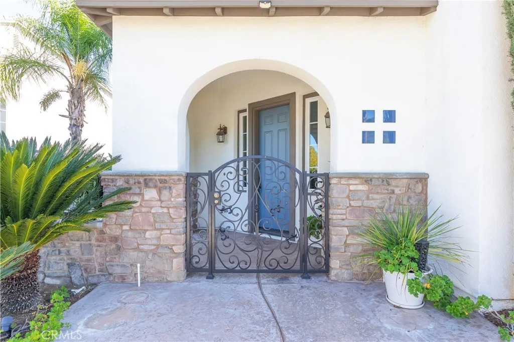 Beautifully upgraded home in the Murrieta Country Roads neighborhood, adjacent to Spencer’s Crossing. This stunning property features extensive hardscape, including a charming front-yard courtyard that creates exceptional curb appeal. The home offers five bedrooms, including a desirable downstairs bedroom highlighted by a gorgeous metal double-door entry. Soaring vaulted ceilings, plantation shutters, and elegant crown molding add to the home’s refined style. A grand double staircase welcomes you from the formal living room and leads upstairs. The main level features wood and tile flooring, while the upstairs bedrooms are comfortably carpeted. In addition to the formal living and dining rooms, the home boasts a spacious family room and a bright breakfast nook. The chef’s kitchen offers abundant counter space, granite countertops, stainless steel appliances, double ovens, and a five-burner cooktop, making it ideal for both everyday living and entertaining. The backyard is set up for entertaining with tropicals, built in BBQ and island and extensive hardscape. Easy care yard! This home also has: 4 Car Garage.