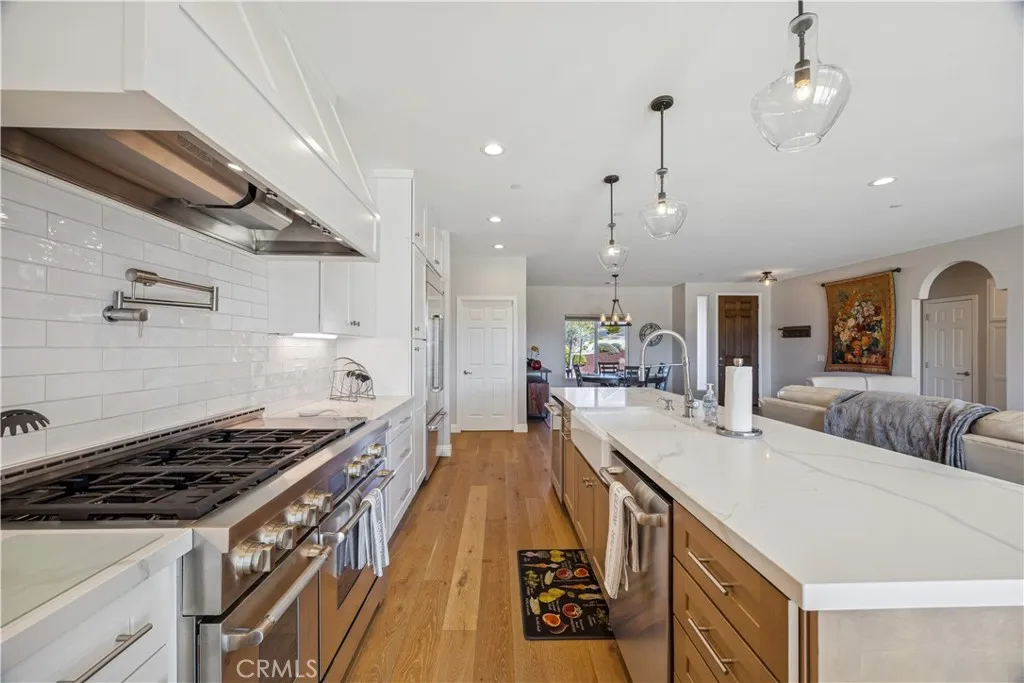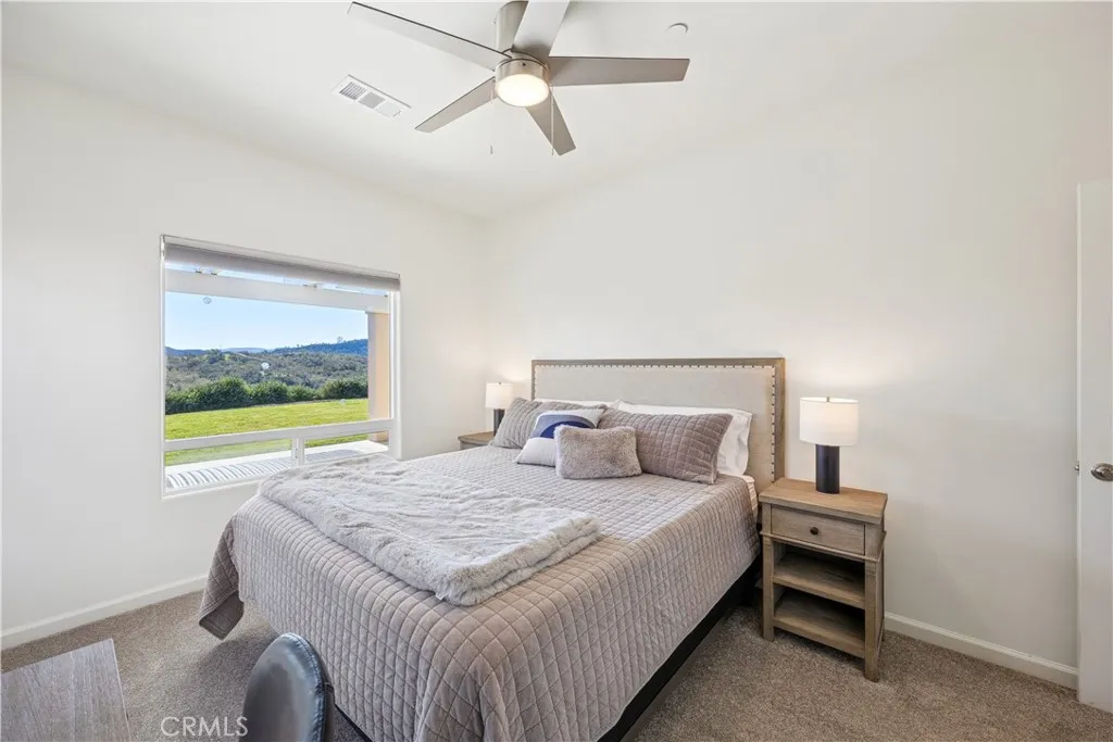Beautiful single level home with breathtaking views of the surrounding hills, offers nearby conveniences yet seclusion for the homeowner who wants to get away from it all. This three-bedroom, 2 bath home offers approximately 1,757 square feet with an open-concept layout that seamlessly connects to the large, covered patio outdoors, complete with a relaxing hot tub – so you can enjoy the serenity of the nearly one third acre property. The interior features wide-plank oak flooring and a gourmet kitchen with premium JennAir appliances and a generous center island, perfect for entertaining. The master suite offers more captivating views, a cozy fireplace and a spa-inspired bath with soaking tub, separate shower, dual vanities and a custom walk-in closet. Two bedrooms and a full bathroom on the other side of the living area complete the layout. On a pocket street with its own gate code, this home is within the Heritage Ranch Community, yet close to the Oak Hill market, gas station, restaurants and elementary school. Heritage Ranch offers Nacimiento lake access, 2 pools, and an equestrian center. It is a FireWise community, certified by Cal Fire, with fire hydrants nearby on the street and the home has a fire suppression system to help protect the home. Nearly self-sufficient, the home has an owned ground-mounted 7kWh solar field, with a 25-year warranty, a Tesla battery back-up and an EV connector in the garage so the owner can charge up their electric vehicle overnight. Propane is onsite and supplies the water heater, HVAC system, fireplace and kitchen stove. An impeccably maintained pastoral retreat with modern technology advantages. If you want a turn-key vacation home or retirement home, the furniture and wall art can be yours too, just ask how.