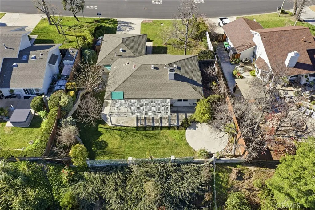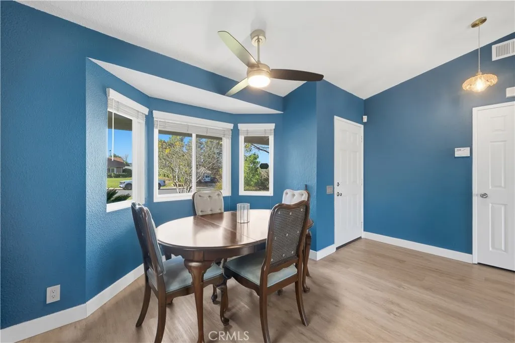 The home offers a warm and inviting layout featuring a spacious living room with a classic brick fireplace and sliding glass doors that open to a tranquil, fully landscaped backyard. Outdoor highlights include fruit trees, and serene mountain views, creating a private retreat for relaxing or entertaining. The kitchen, family, and dining areas are enhanced by light wood flooring, vaulted ceilings, and an abundance of natural light, providing a charming setting for gatherings. The primary bedroom includes dual sinks and a separate storage area for added convenience. Additional features include a two-car garage with a laundry area separated from the main garage space, along with shelving and extra cabinetry for storage. The home sits set back from the street, complemented by a fully landscaped front yard, adding to its curb appeal and privacy.
