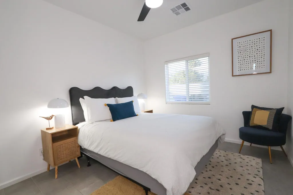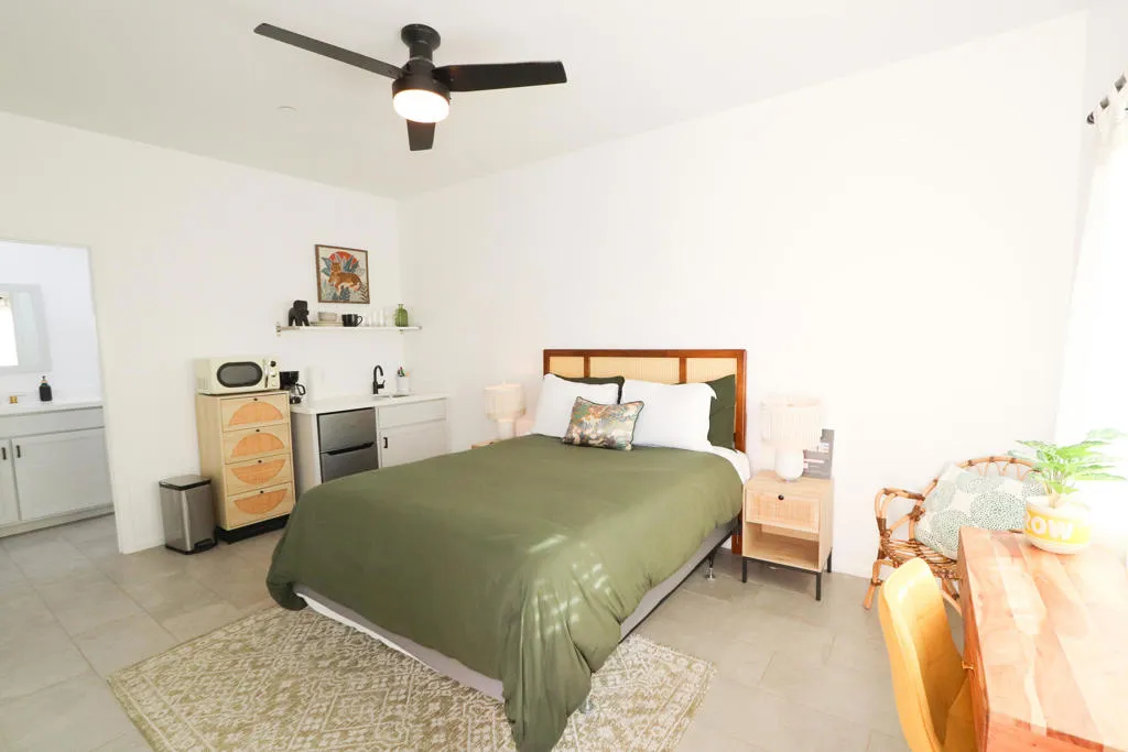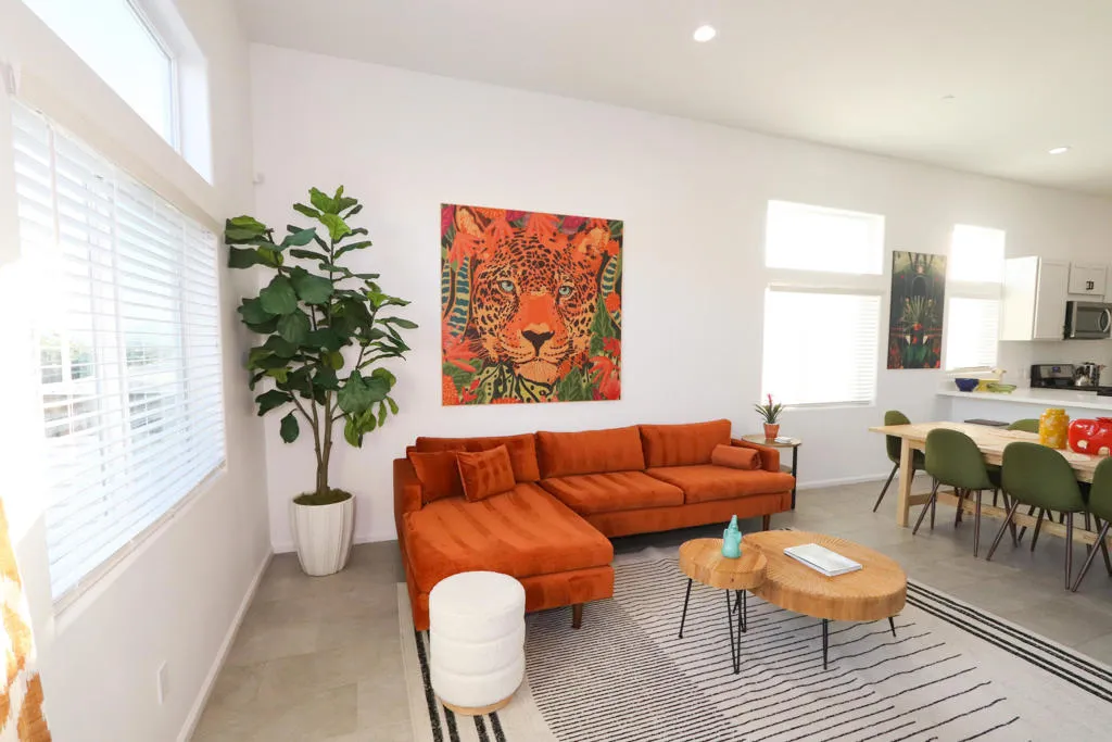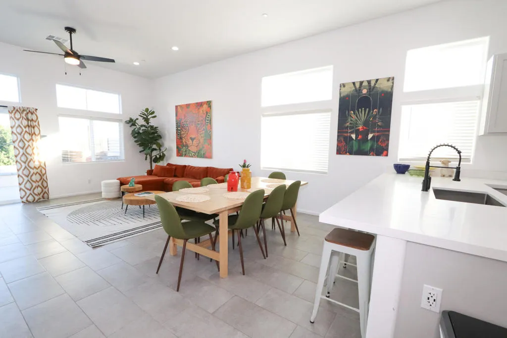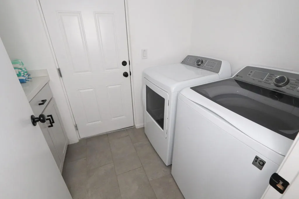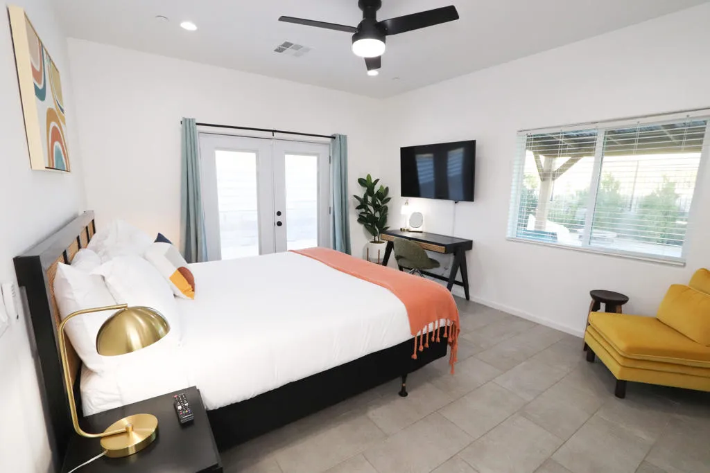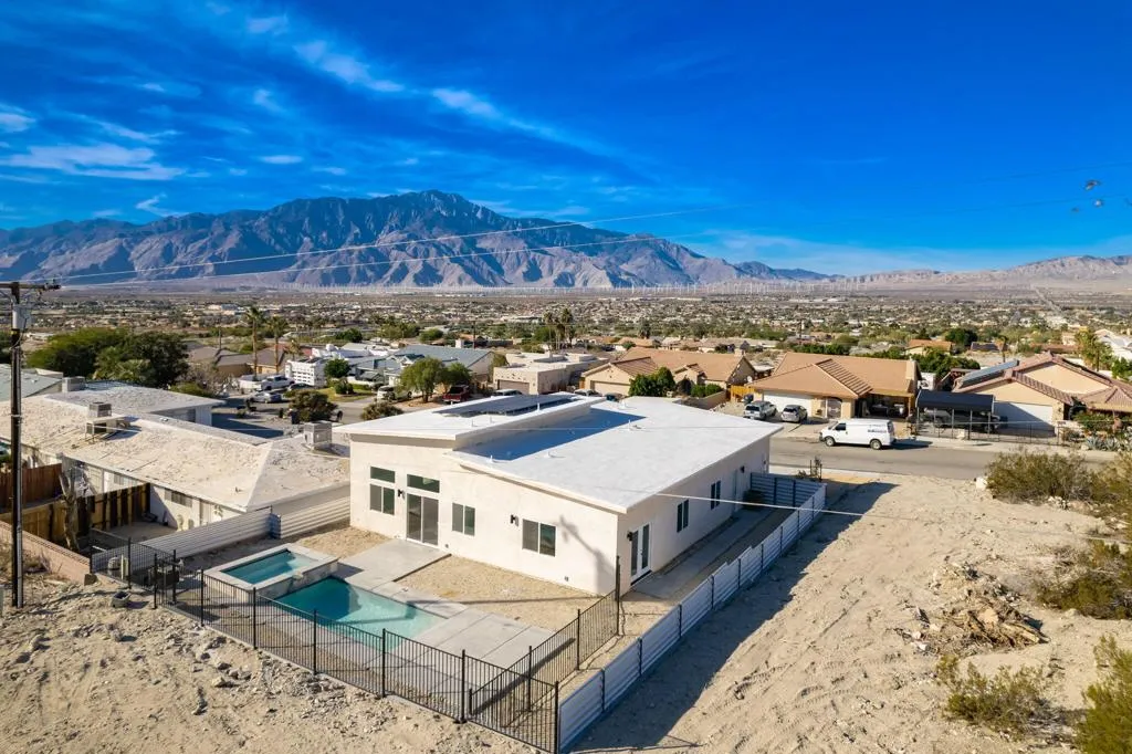 Newer construction Modern / Contemporary with POOL / SPA, CASITA with private entrance and kitchenette, and PAID OFF SOLAR! Modern / contemporary design, tiled flooring throughout, expansive open floor plan, with large windows to let in lots of natural light. NEW Appliance package included in sale: Washer and Dryer, Refrigerator, Dishwasher, and over the stove Microwave. Tall ceilings, desirable area of Desert Hot Springs, short-term rentals ok. 20 min approx. to Palm Springs, short drive to Joshua Tree. No HOA. Furniture negotiable.