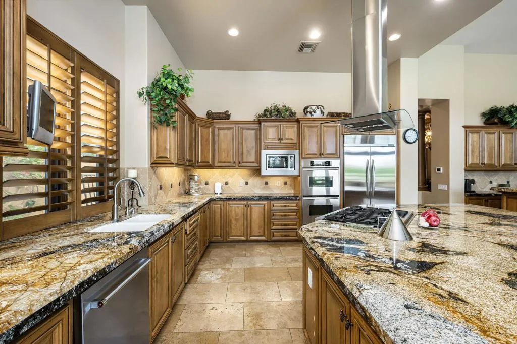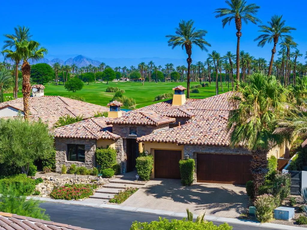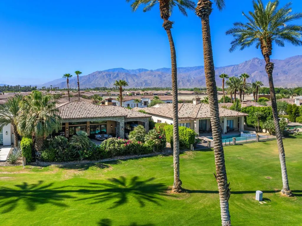 A true European-inspired retreat in the heart of the desert, this exceptional 4,337 sq ft residence in the exclusive Palms Country Club combines refined Old-World elegance with contemporary comfort and commanding views. Set on an interior fairway with no homes across the 7th hole, the property captures sweeping vistas of the lush green course, sparkling lake, and dramatic Santa Rosa Mountains. Crafted with exquisite attention to detail, the home is rich with architectural charactera"arched passageways, soaring beamed ceilings, extensive stonework, and stately columns create a sense of timeless charm. Inside, you'll find travertine flooring, multiple fireplaces, beautiful wood built-ins, granite slab countertops, custom cabinetry, and detailed mosaic inlays throughout. The expansive Great Room floor plan is ideal for both relaxing and entertaining, featuring a full sit-down bar and seamless flow to the outdoor living spaces. The chef's kitchen includes a commercial stovetop, stainless steel appliances, a custom flume hood, and a generous center island. The luxurious primary suite offers two spacious walk-in closets, a romantic fireplace, and a spa-like bathroom with a sunken tub framed in marble, complete with its own fireplace for added ambiance. Step outside to a spectacular resort-style setting: a large pavered patio, pool and spa with cascading water features, built-in BBQ, firepit, and multiple seating areasa"all designed to enjoy unforgettable desert sunsets. The detached casita with private entrance offers beautifully appointed guest accommodations. Additional highlights include a 600+ bottle temperature-controlled wine cellar, custom window shutters, a 3-car garage, and a beautifully landscaped lot over a quarter acre. A rare blend of privacy, sophistication, and stunning natural beautya"this is desert living at its most refined.