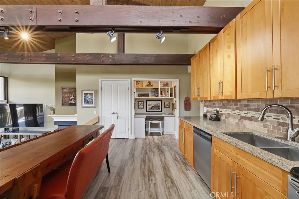 Inside, floor-to-ceiling windows and vaulted, beamed ceilings create an open, airy feel while maximizing the waterfront outlook. The home has been beautifully updated throughout, offering a move-in-ready environment with a refined yet relaxed coastal aesthetic.